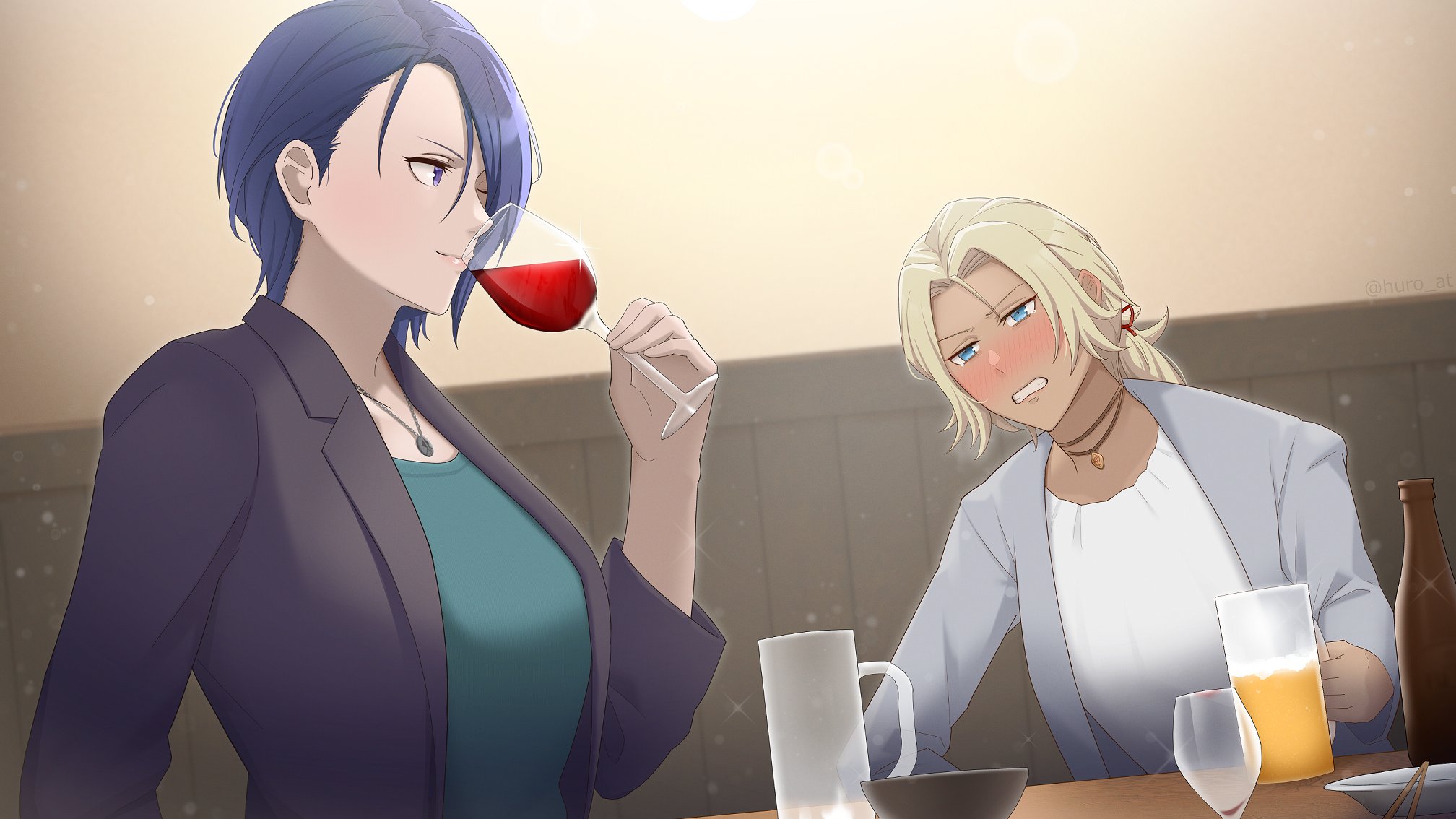 2girls black_jacket blonde_hair blue_hair blush breasts catherine_(fire_emblem) clenched_teeth commentary_request contemporary cup drinking_glass fire_emblem fire_emblem:_three_houses furo_atsushi highres holding holding_cup jacket jewelry large_breasts multiple_girls necklace nintendo one_eye_closed ponytail shamir_nevrand short_hair sitting teeth wine_glass