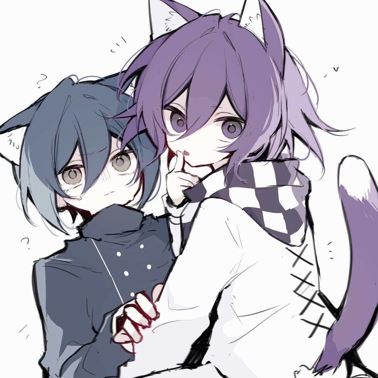 2boys ? ?? ahoge animal_ears black_hair black_jacket brown_eyes buttons cat_boy cat_ears cat_tail checkered_clothes checkered_scarf cross-laced_clothes cross-laced_top danganronpa_(series) danganronpa_v3:_killing_harmony flipped_hair hair_between_eyes heart highres jacket long_sleeves looking_at_viewer looking_back male_focus medium_hair multiple_boys oma_kokichi pale_color pants purple_eyes purple_hair saihara_shuichi scarf short_hair simple_background sitting sitting_on_person suisei_(su_rkgk) tail two-tone_scarf upper_body yaoi