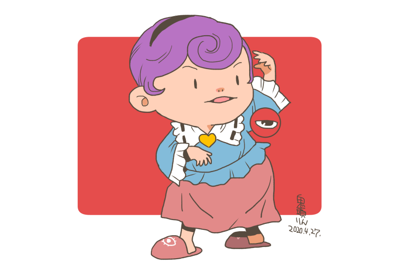 1girl arm_up black_hairband blue_shirt commentary_request dated frilled_shirt_collar frilled_sleeves frills full_body hairband komeiji_satori long_sleeves looking_afar onikobe_rin open_mouth purple_hair purple_skirt purple_slippers red_background ribbon-trimmed_collar ribbon_trim shirt short_hair simple_background skirt slippers solid_oval_eyes solo third_eye touhou two-tone_background white_background