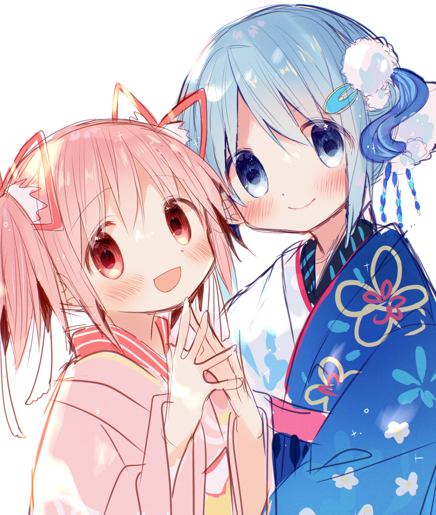2girls blue_eyes blue_hair blue_kimono blush commentary floral_print floral_print_kimono hair_ornament hair_ribbon hairclip happy highres japanese_clothes kaname_madoka kimono looking_at_viewer mahou_shoujo_madoka_magica mahou_shoujo_madoka_magica_(anime) miki_sayaka multiple_girls open_mouth pink_eyes pink_hair pink_kimono print_kimono ribbon short_hair short_twintails smile steepled_fingers suisei_(su_rkgk) twintails upper_body white_background