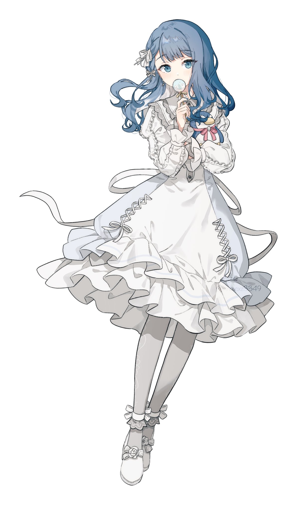 1girl animal-themed_food back_bow bloom_festival_(project_sekai) blue_eyes blue_hair blunt_bangs bow braid candy collared_dress covered_mouth covering_own_mouth cross-laced_clothes dot_nose dress dress_ribbon earrings food footwear_bow frilled_dress frills full_body gradient_hair grey_pantyhose hair_behind_ear hair_bow hand_up highres holding holding_candy holding_food holding_lollipop holding_stuffed_toy jewelry kiritani_haruka lollipop long_hair long_sleeves looking_at_viewer migolu multicolored_hair official_alternate_costume official_alternate_hair_color official_alternate_hair_length official_alternate_hairstyle pantyhose project_sekai puffy_long_sleeves puffy_sleeves ribbon shoes side_braid simple_background solo standing stuffed_animal stuffed_penguin stuffed_toy swept_bangs white_background white_bow white_dress white_hair white_ribbon white_shoes