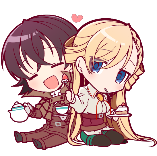 1boy 1girl araragi_ayune black_hair black_pantyhose blonde_hair blue_eyes bolo_tie brown_jacket brown_pants cake cake_slice chibi chibi_only closed_eyes collared_shirt commentary corset crossed_bangs cup food fork full_body green_shorts grey_shirt heart holding holding_fork holding_saucer holding_teapot isshiki-san_wa_koi_wo_shiritai. jacket long_hair long_sleeves looking_at_viewer meishi_leland open_mouth pants pantyhose pantyhose_under_shorts red_corset rinna_milford saucer shirt short_hair shorts simple_background sitting smile untranslatable_commentary teacup teapot white_background yokozuwari