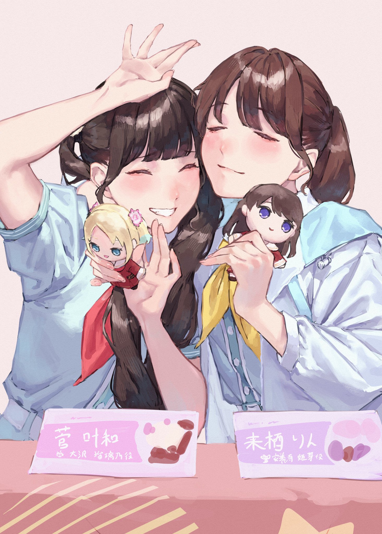 2girls ^_^ animification arm_up black_hair blue_dress blunt_bangs blush brown_hair character_doll closed_eyes closed_mouth commentary_request doll dress fujishima_megumi grin hasu_no_sora_school_uniform highres holding holding_doll hood hooded_jacket jacket kan_kanna kurusu_rin kyurumaru link!_like!_love_live! long_hair long_sleeves love_live! multiple_girls nameplate neckerchief open_clothes open_jacket osawa_rurino ponytail puffy_short_sleeves puffy_sleeves raised_inner_eyebrows red_neckerchief saidamoosu sailor_dress school_uniform short_sleeves sidelocks smile summer_uniform twintails virtual_youtuber voice_actor white_jacket yellow_neckerchief