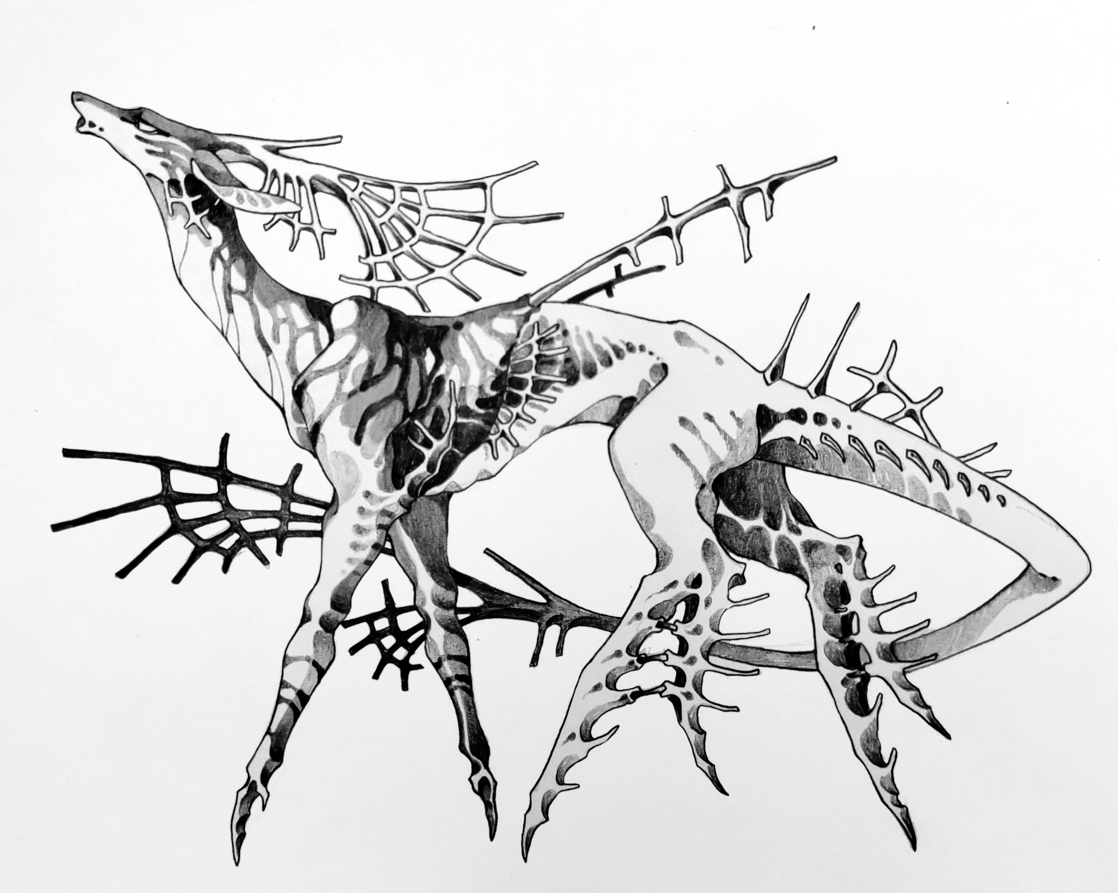 absurdres antlers creature creature_focus from_side full_body greyscale high_contrast highres horns monochrome no_humans original pointy_ears simple_background solo spines tail white_background xiaoqiya05426