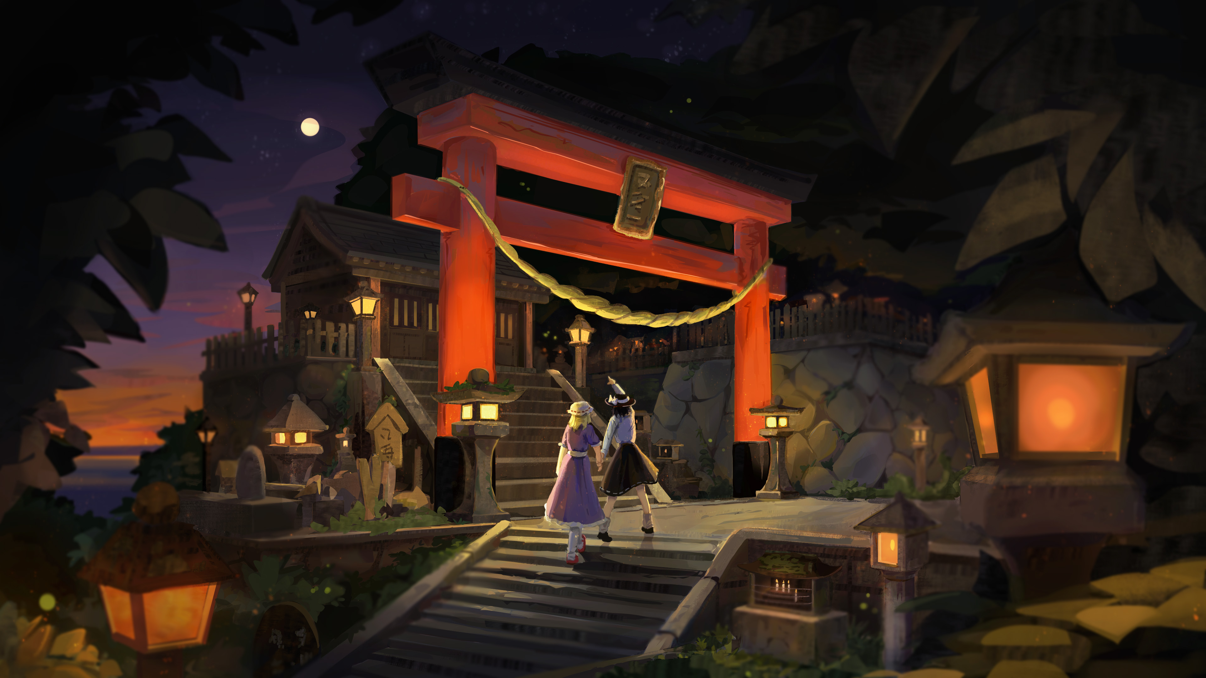 2girls absurdres black_hair black_hat black_shoes black_skirt blonde_hair blurry candle cloud danielhyeunkim depth_of_field dress fence foliage from_behind full_moon hat highres hokora_(shrine) holding_another's_wrist long_sleeves maribel_hearn moon moss multiple_girls night pointing pointing_up purple_dress red_shoes rope sash scenery shimenawa shirt shoes short_sleeves shrine sign skirt sky socks stairs stone_lantern stone_stairs stone_wall sunset torii touhou tree usami_renko white_hat white_sash white_shirt white_socks wooden_fence