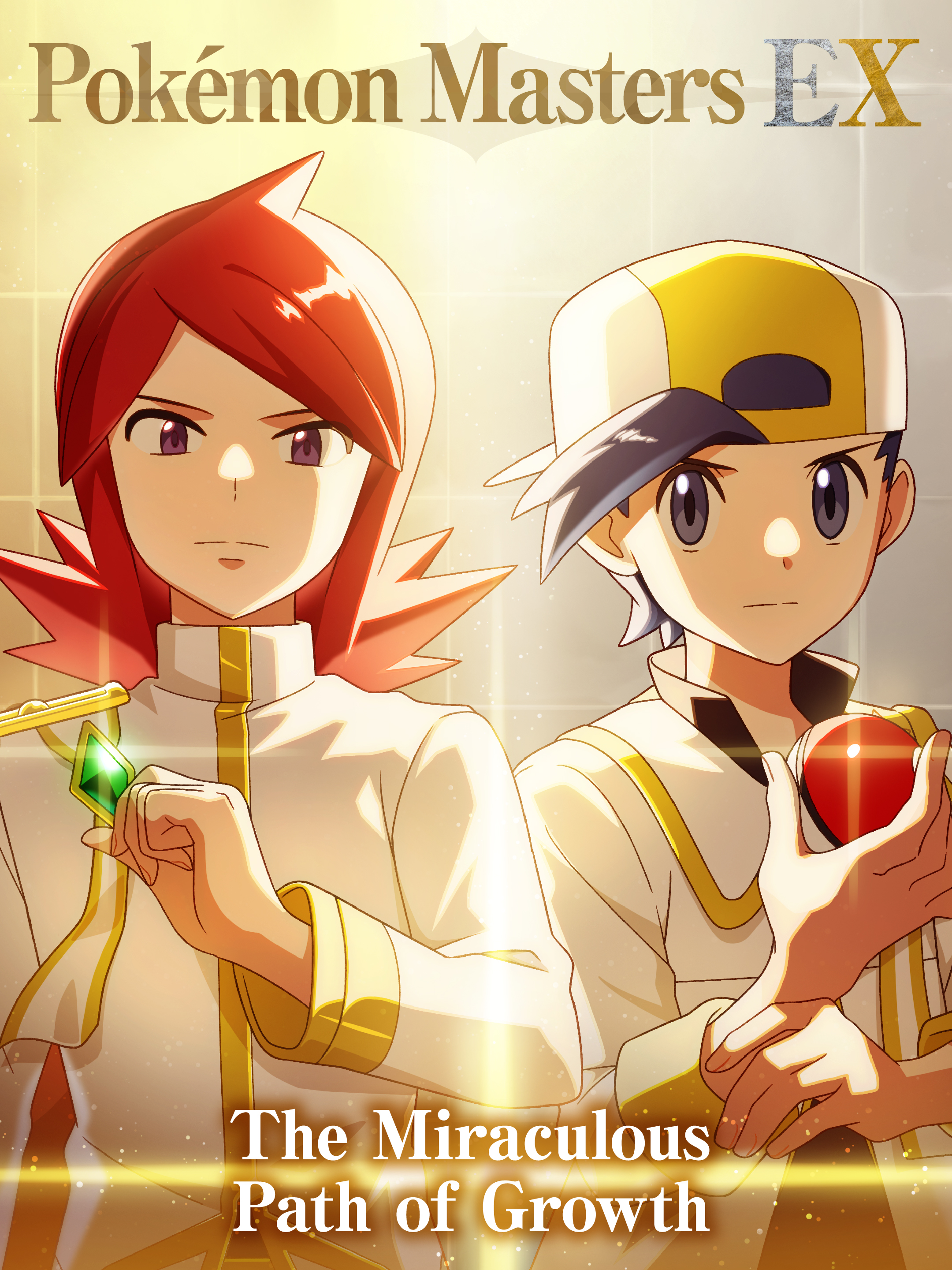 2boys absurdres black_hair clenched_hand closed_mouth commentary english_commentary ethan_(arc_suit)_(pokemon) ethan_(pokemon) gem green_gem grey_eyes hand_up hat highres holding holding_poke_ball jacket long_hair long_sleeves looking_at_viewer male_focus multiple_boys nintendo official_alternate_costume official_art parted_bangs poke_ball poke_ball_(basic) pokemon pokemon_masters_ex red_hair short_hair silver_(arc_suit)_(pokemon) silver_(pokemon) split_mouth white_jacket