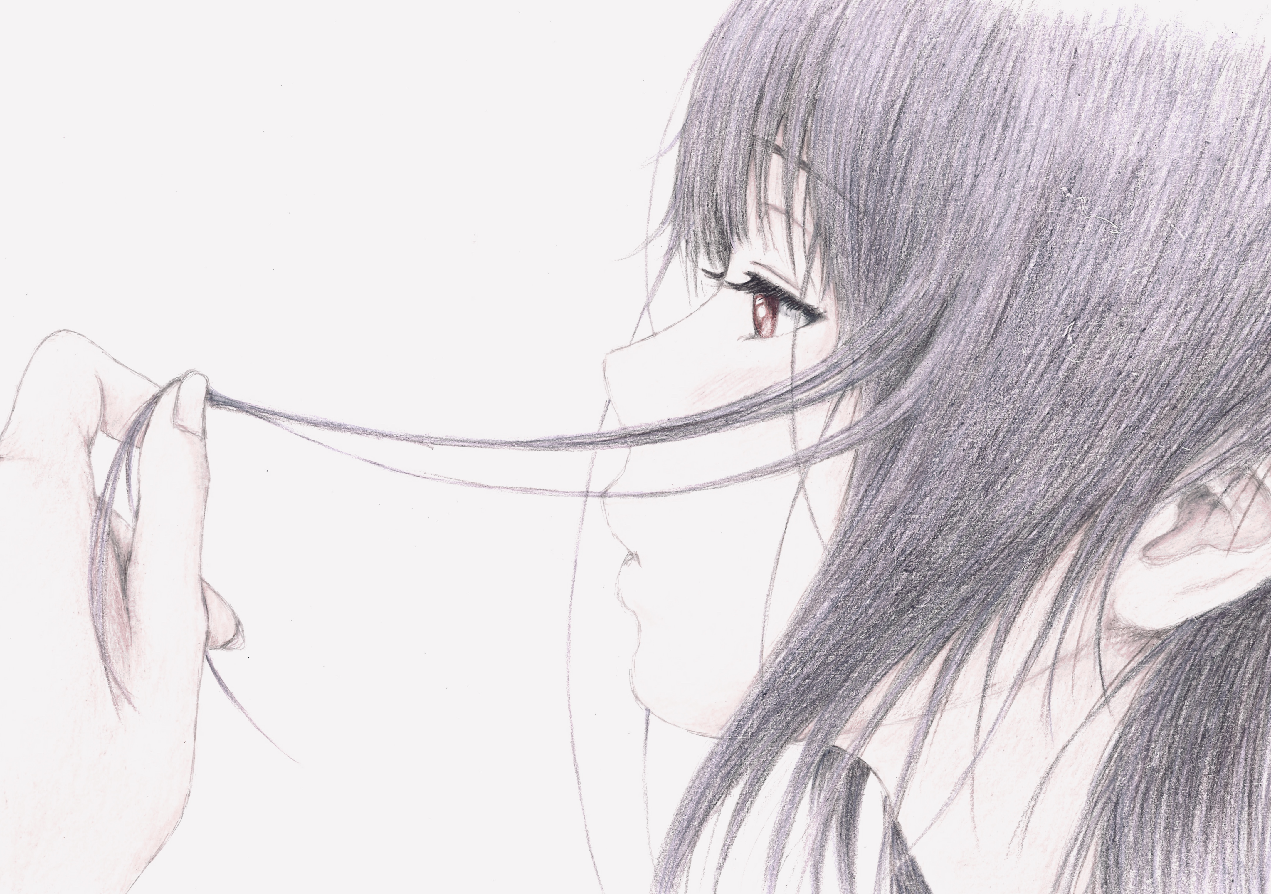 1girl absurdres bbmasa black_hair blue_background gradient_background hibike!_euphonium highres holding holding_own_hair liz_to_aoi_tori long_hair parted_lips playing_with_own_hair portrait profile red_eyes solo translation_request yoroizuka_mizore