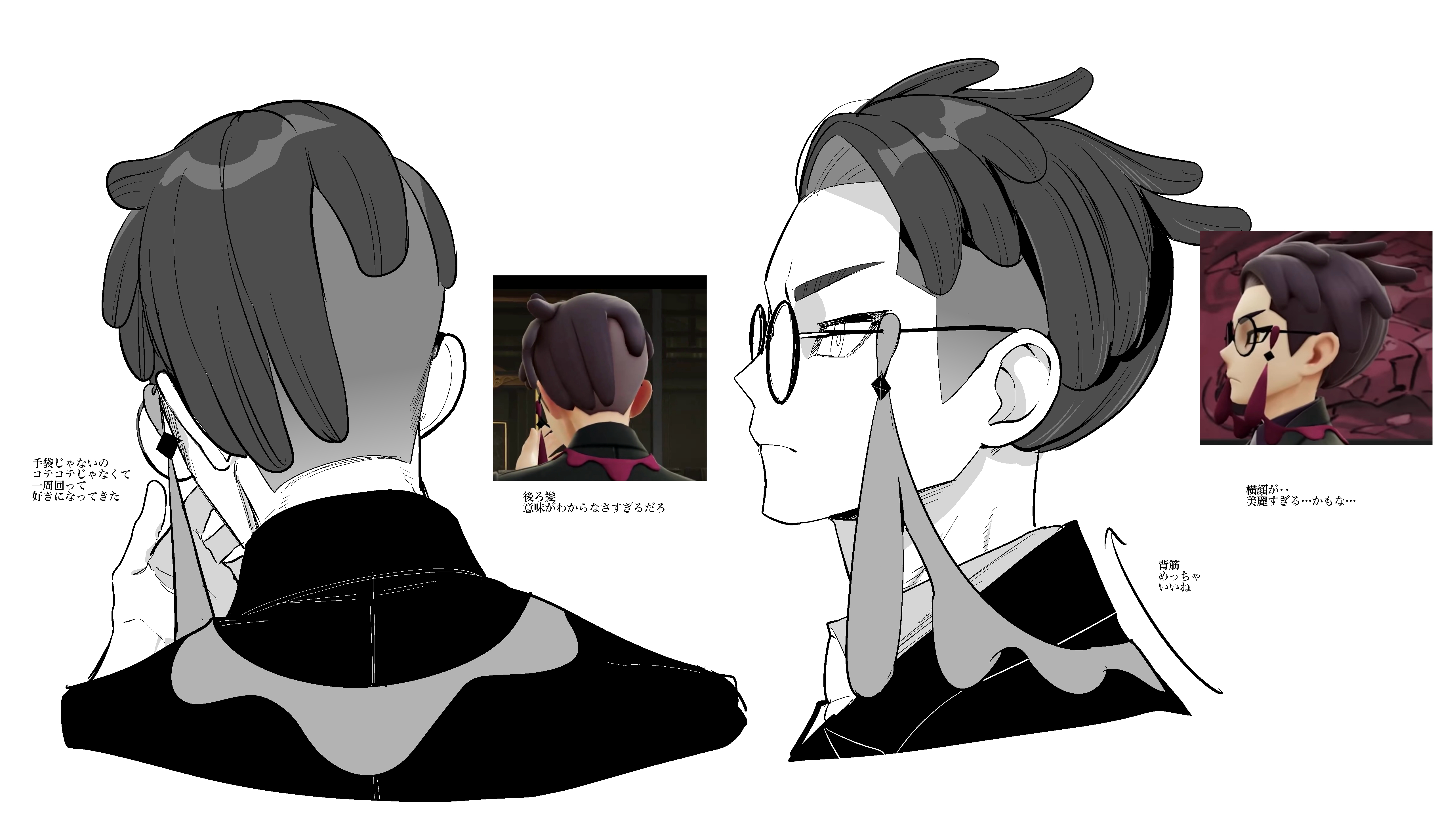 1boy absurdres arbok closed_mouth corbeau_(pokemon) from_side gen_1_pokemon glasses highres jacket male_focus multiple_views nintendo pokemon pokemon_legends:_z-a profile reference_inset reference_sheet round_eyewear sakakesu short_hair sideburns simple_background translation_request undercut white_background