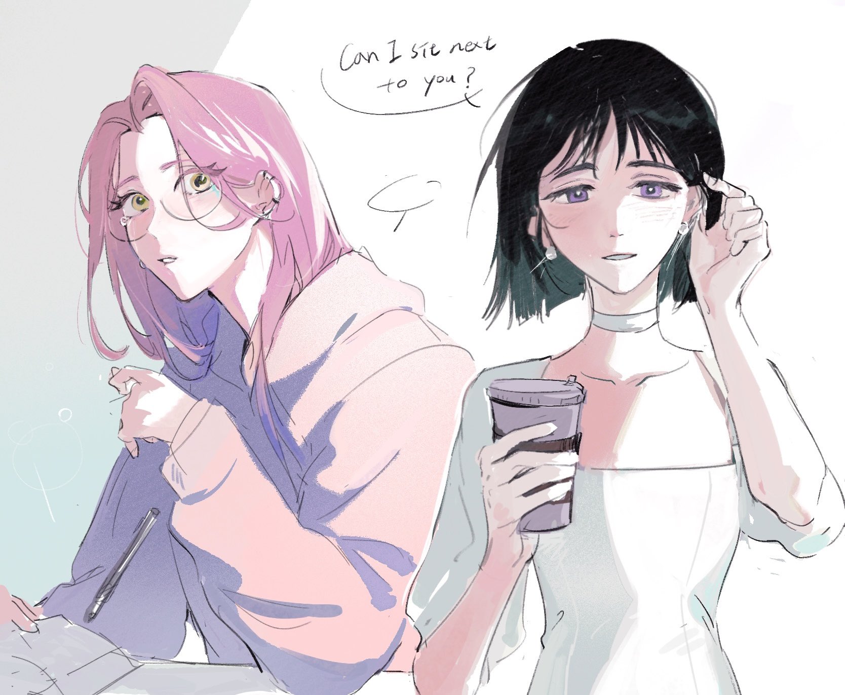 22_(22mimi2434) 2girls alien_stage alternate_costume black_hair bob_cut choker commentary cup disposable_coffee_cup disposable_cup earrings english_text glasses grey_hoodie highres holding holding_cup hood hoodie jewelry long_sleeves mizi_(alien_stage) multiple_girls pen pink_hair purple_eyes round_eyewear square_neckline sua_(alien_stage) tucking_hair white_choker