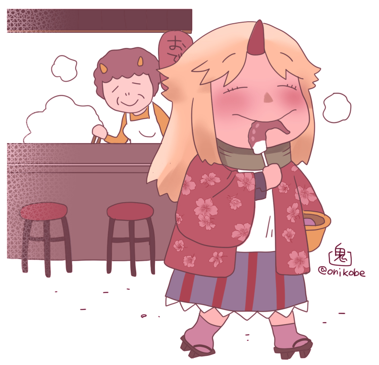 2girls black_sandals blonde_hair brown_hair closed_eyes closed_mouth commentary_request counter eating floral_print full_body geta green_scarf grey_skirt haori horns hoshiguma_yuugi japanese_clothes long_hair multiple_girls octopus_(food) onikobe_rin purple_socks red_haori red_horns red_skirt sandals scarf shirt single_horn skirt smile socks steam stool striped_clothes striped_skirt touhou vertical-striped_clothes vertical-striped_skirt white_background white_shirt