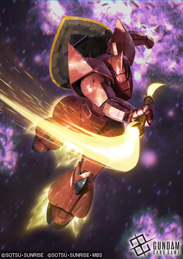 commentary_request company_name copyright_name copyright_notice double_blade energy_sword explosion flying gelgoog_s_char_custom glowing glowing_eye gundam holding holding_sword holding_weapon horns mecha mecha_focus mobile_suit mobile_suit_gundam no_humans official_art one-eyed red_eyes robot science_fiction shield shield_on_back single_horn slashing solo space sunrise_(company) sword toriyufu weapon zeon