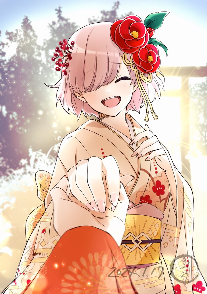 1girl 1other backlighting chaldea_logo closed_eyes eyelashes facing_viewer fate/grand_order fate_(series) floral_print flower grin hair_flower hair_ornament holding_hands japanese_clothes kimiori_(yuapple241) kimono mash_kyrielight nail_polish open_mouth pink_hair smile tree