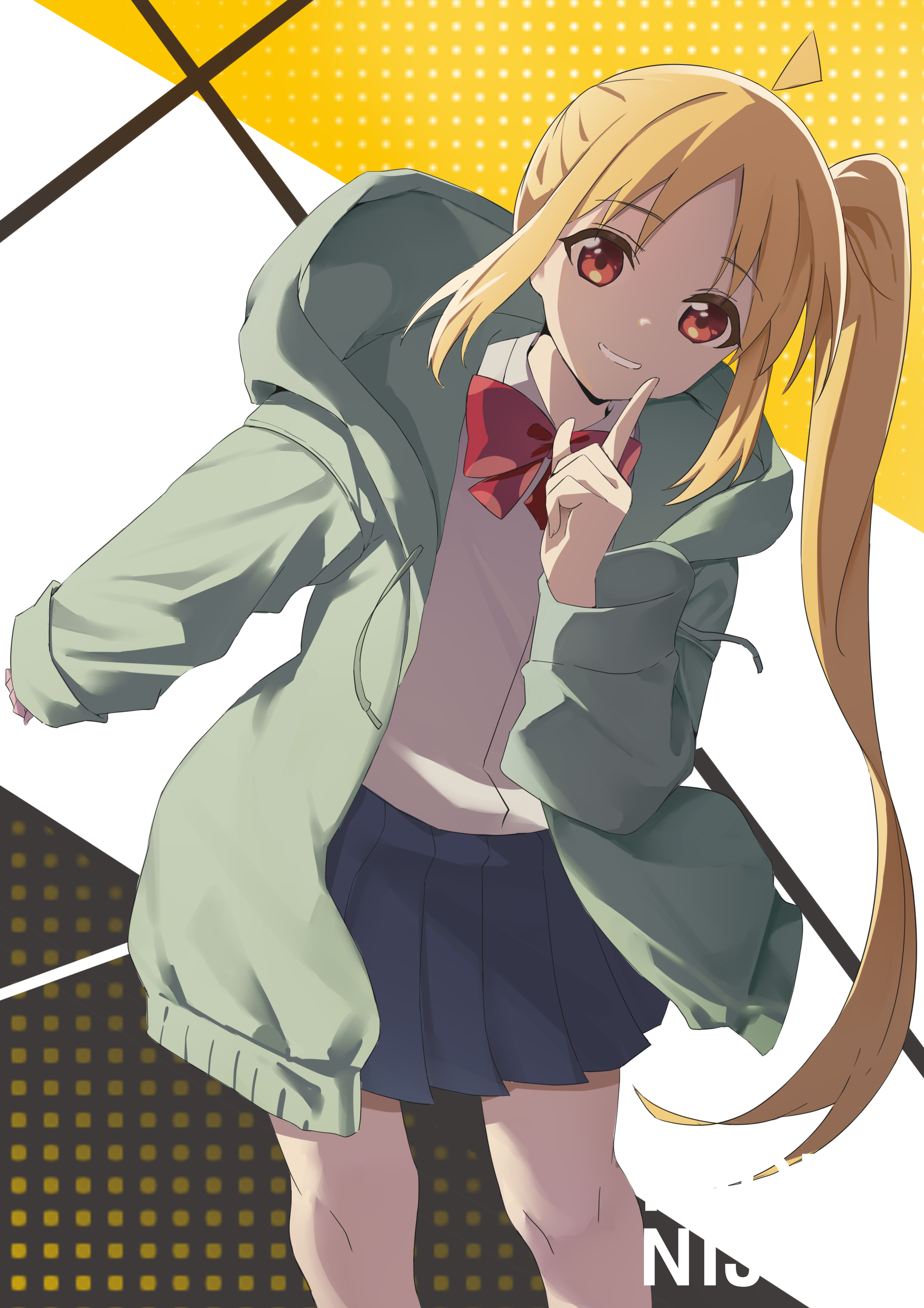 1girl abstract_background absurdres ahoge blonde_hair blue_skirt bocchi_the_rock! bow bowtie cardigan character_name commentary_request drawstring feet_out_of_frame green_cardigan grin hand_up highres hood hooded_cardigan ijichi_nijika index_finger_raised jiejeat long_hair long_sleeves looking_at_viewer miniskirt open_cardigan open_clothes parted_bangs parted_lips pleated_skirt polka_dot_bow polka_dot_bowtie red_bow red_bowtie red_eyes school_uniform shimokitazawa_high_school_uniform shirt shirt_tucked_in side_ponytail skirt smile solo standing transparent_background white_shirt wide_sleeves