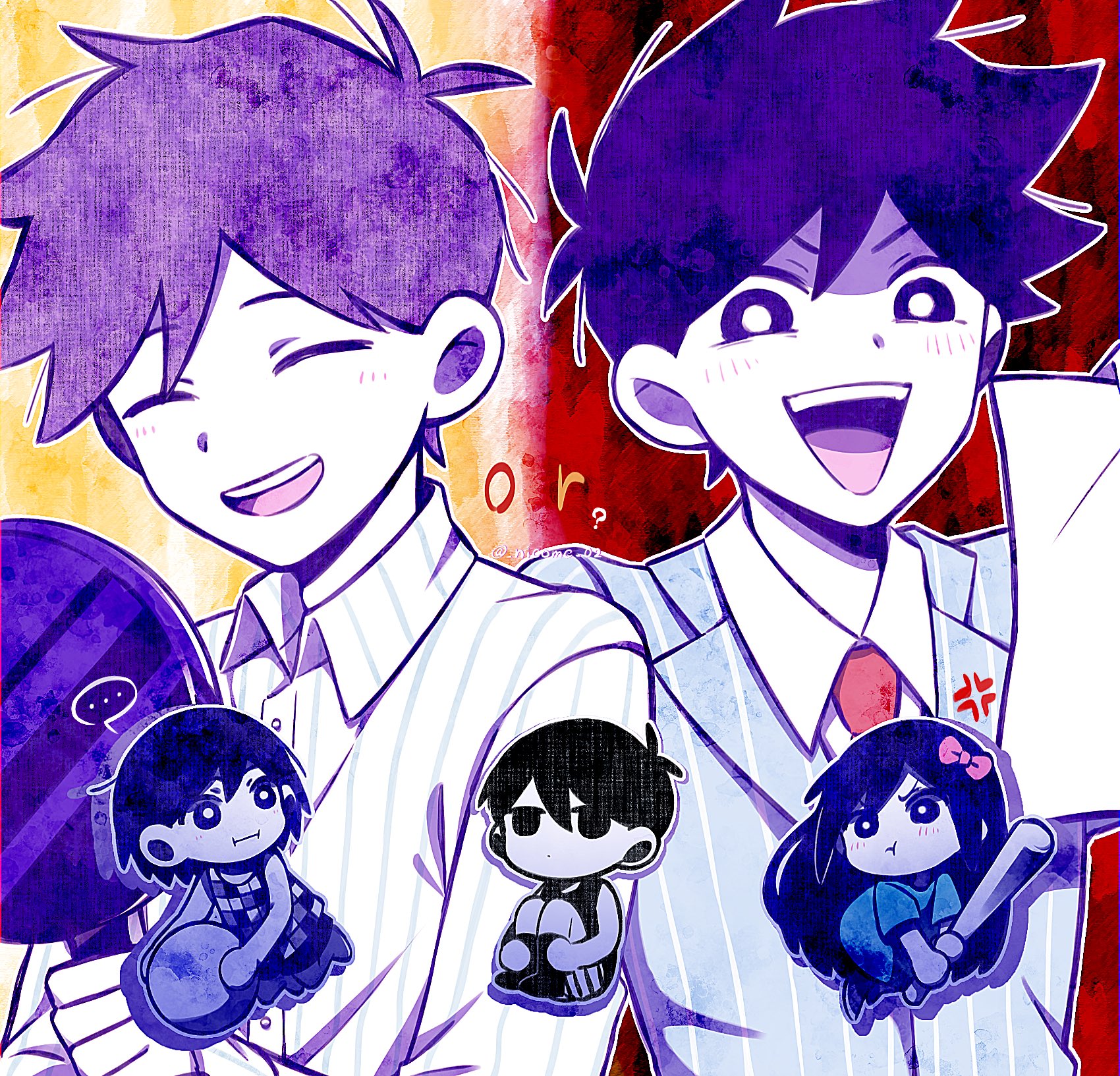 ... 1girl 3boys anger_vein antenna_hair aubrey_(headspace)_(omori) aubrey_(omori) ball baseball_bat black_eyes black_hair black_socks black_tank_top blue_shirt blue_suit bossman_hero bright_pupils brothers chibi closed_mouth colored_skin double-parted_bangs expressionless formal_clothes frying_pan hero_(headspace)_(omori) hero_(omori) highres holding holding_ball holding_baseball_bat holding_frying_pan holding_paper kel_(headspace)_(omori) kel_(omori) knees_up long_hair long_shirt long_sleeves looking_at_another looking_at_viewer multiple_boys necktie nicome_02 omori omori_(omori) open_mouth pajamas paper pinstripe_pattern pinstripe_suit pout purple_eyes purple_hair red_necktie shirt short_hair short_sleeves shorts siblings smile socks speech_bubble spoken_ellipsis striped_clothes striped_shorts suit t-shirt tank_top teeth twitter_username upper_teeth_only vertical-striped_clothes vertical-striped_shorts white_pupils white_shorts white_skin