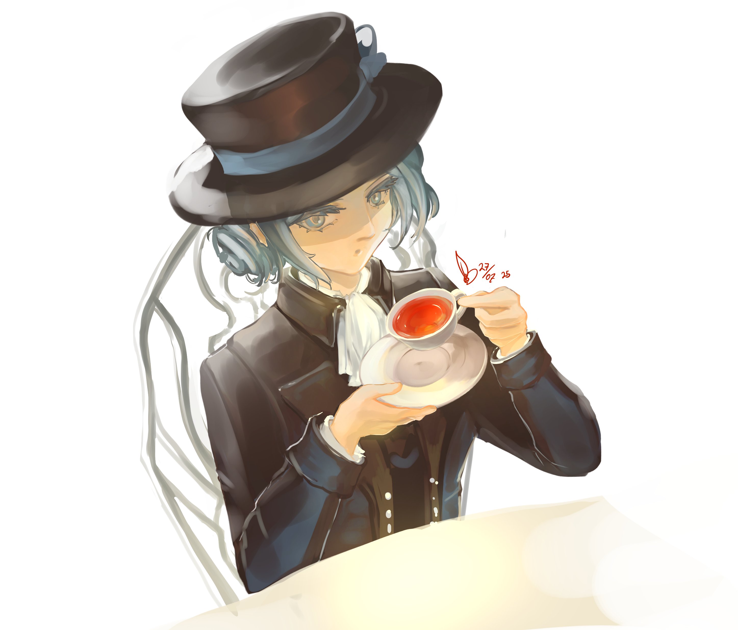 1girl :o absurdres ascot black_coat black_hat boater_hat chair coat cup dated grey_eyes grey_hair hair_bun hat highres holding holding_cup holding_saucer looking_down moss_(mozzutan) reverse:1999 saucer shirt single_side_bun solo table tea teacup upper_body vertin_(reverse:1999) white_ascot white_background white_shirt