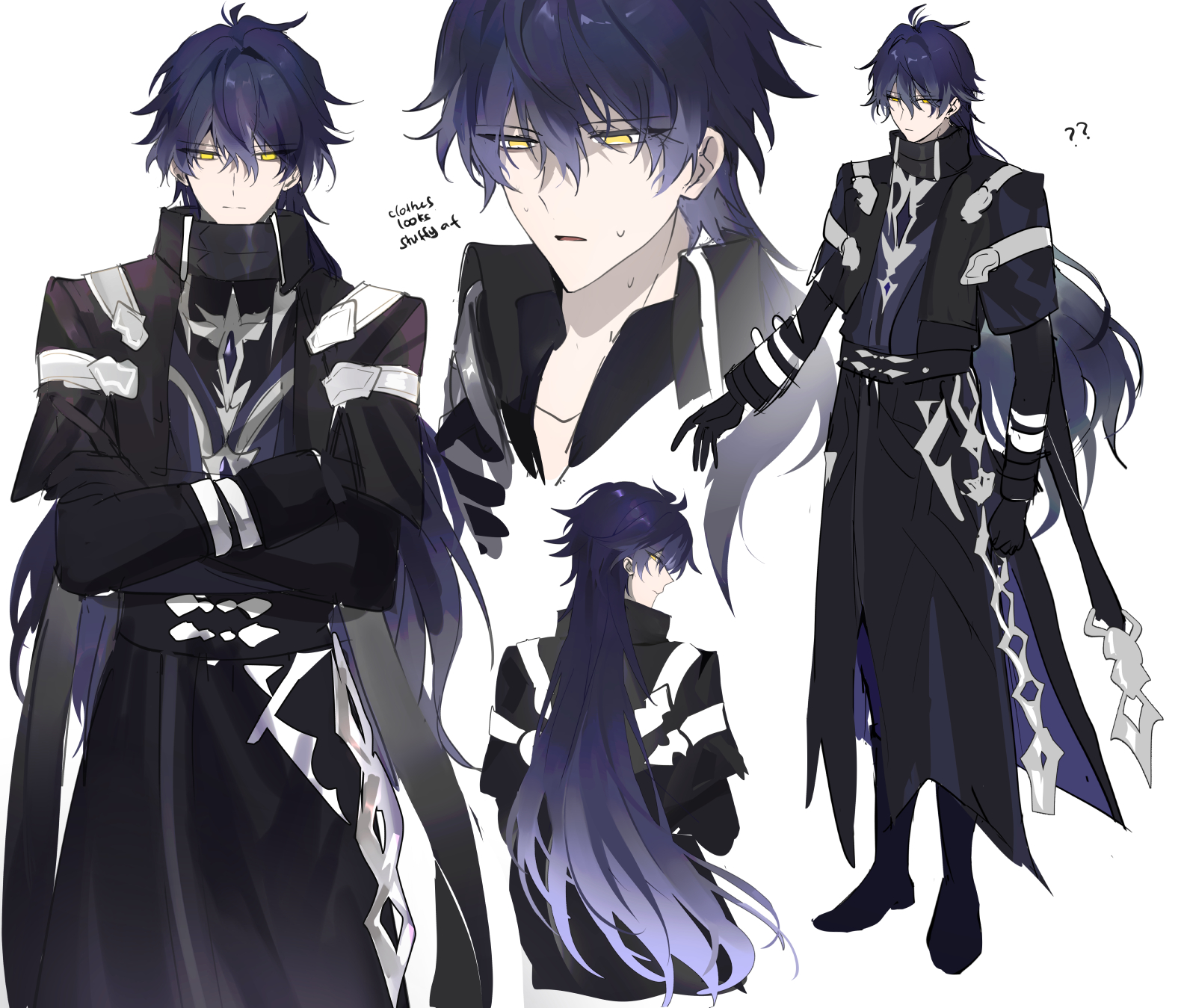 1boy ? ?? belt black_coat black_gloves black_shoes blue_hair closed_mouth coat collared_jacket commentary crossed_arms efu_(angelschatedral99) english_commentary english_text flins_(genshin_impact) genshin_impact gloves gradient_hair highres jacket layered_sleeves long_hair long_sleeves male_focus multicolored_hair multiple_views open_collar open_mouth shoes short_over_long_sleeves short_sleeves standing sweat two-sided_coat two-sided_fabric white_background yellow_eyes