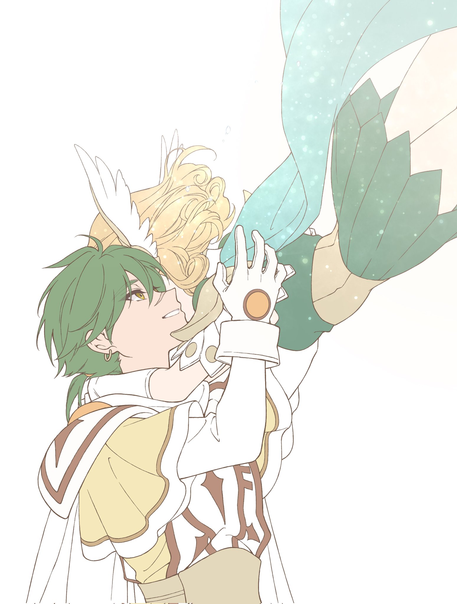 1boy 1girl arms_around_neck blonde_hair blue_cape cape feather_hair_ornament feathers ferio_(rayearth) gloves green_hair green_skirt grin hair_ornament hand_up highres hououji_fuu magic_knight_rayearth masami_(souzou_jinsei_sanka) midair ponytail scar scar_on_face scar_on_nose short_hair short_ponytail simple_background skirt smile upper_body white_background white_gloves yellow_eyes