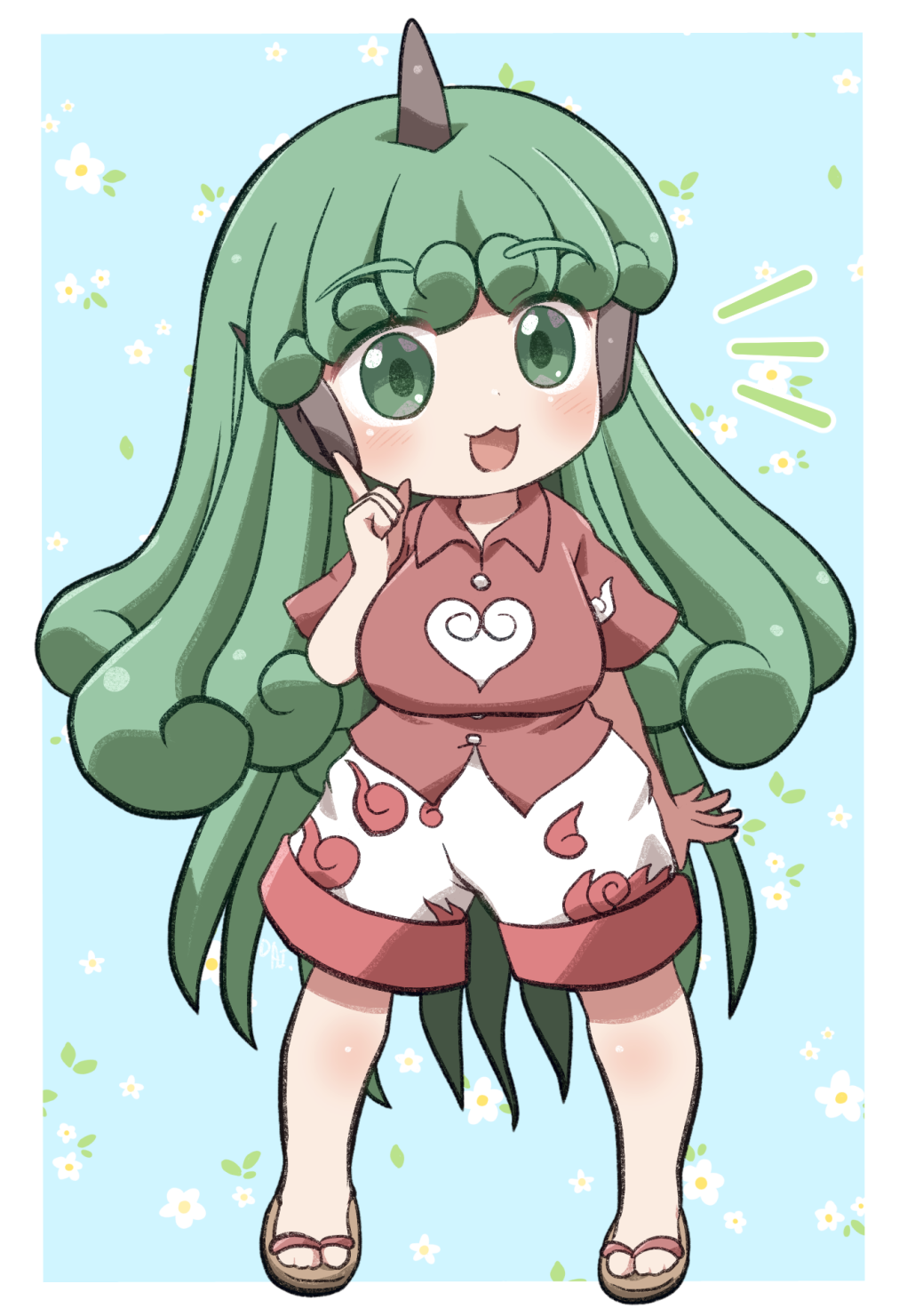 1girl :3 :d blue_background blush border breasts brown_sandals collared_shirt commentary_request curly_hair floral_background full_body green_eyes green_hair hand_up highres horns index_finger_raised komainu_ears komainu_girl komano_aunn long_hair looking_at_viewer notice_lines open_mouth outside_border red_shirt rokugou_daisuke sandals shirt short_sleeves shorts signature single_horn smile solo standing touhou white_border white_shorts