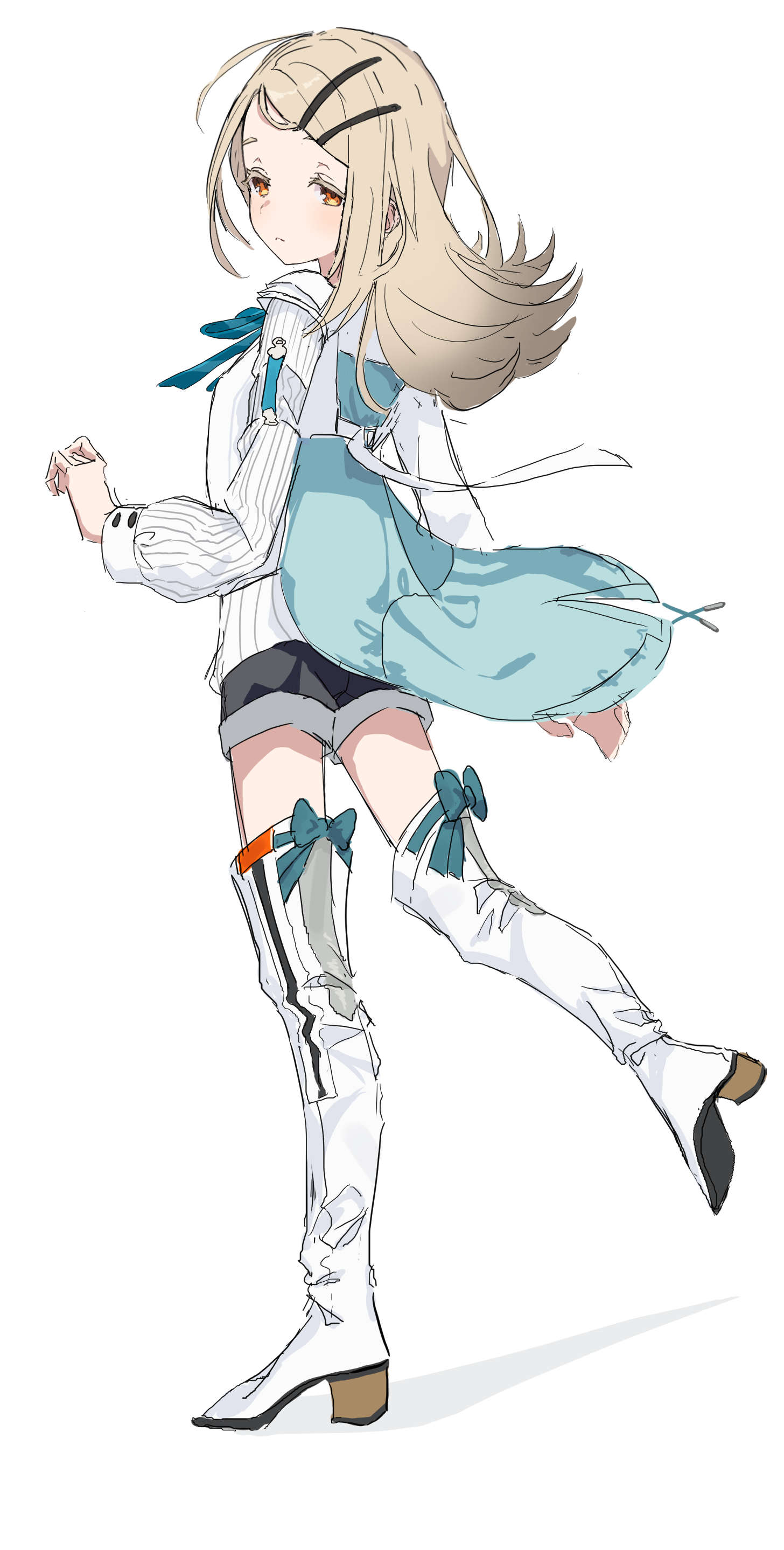 1girl absurdres black_shorts blonde_hair blush boots closed_mouth commentary expressionless from_behind full_body gakuen_idolmaster hair_ornament hairclip hajime_(idolmaster) high_heel_boots high_heels highres idolmaster jacket leg_up long_hair long_sleeves looking_at_viewer looking_back neck_ribbon nune_(60569) orange_eyes ribbon shinosawa_hiro shorts simple_background solo thigh_boots white_background white_jacket