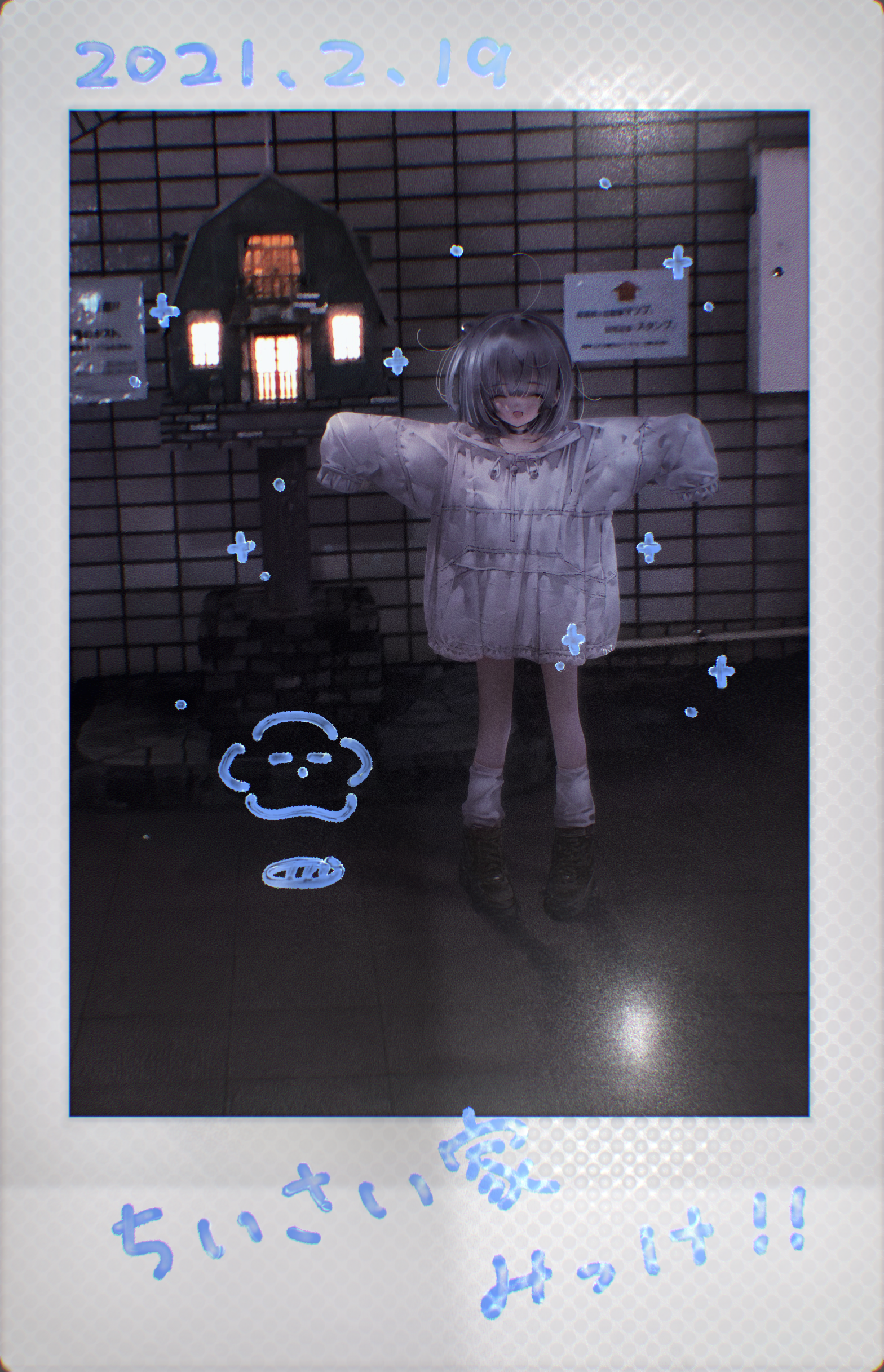 1girl 2021 absurdres arms_up black_shoes border closed_eyes coat commentary dated facing_viewer fake_photograph full_body grey_hair highres long_sleeves medium_hair open_mouth original outstretched_arms polaroid_photo shiratsuyu_mone shoes sleeves_past_fingers sleeves_past_wrists smile socks solo spread_arms standing untranslatable_commentary translation_request white_border white_coat white_socks