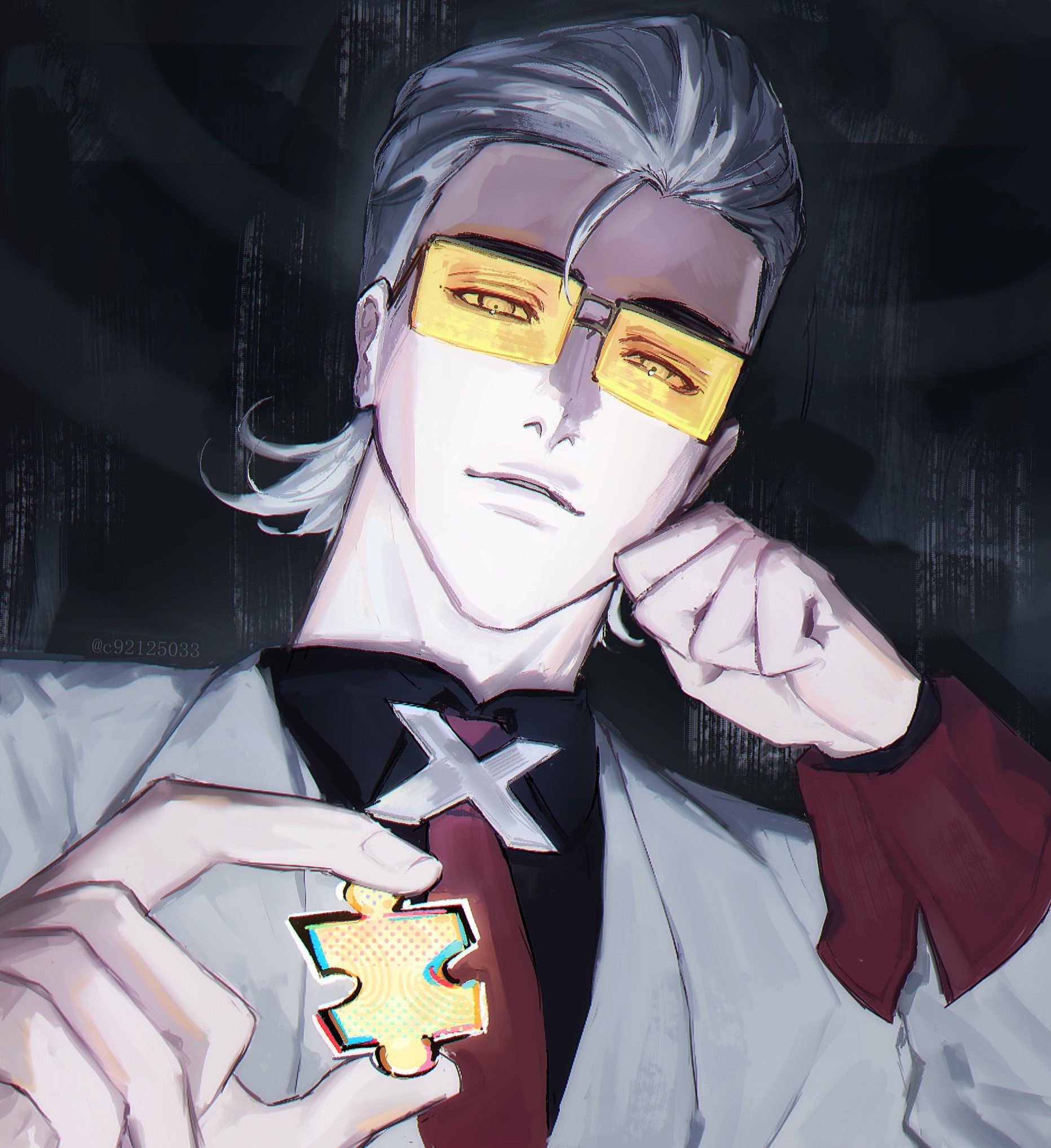 .kireen 1boy black_background black_shirt brooch clenched_hand commentary english_commentary grin hair_slicked_back hand_on_own_chin highres holding_puzzle_piece jewelry looking_at_viewer looking_down loose_hair_strand male_focus necktie puzzle_piece red_necktie shirt simple_background smile solo tinted_eyewear to_be_hero_x upper_body vest white_hair white_vest x_(to_be_hero_x) yellow-tinted_eyewear yellow_eyes