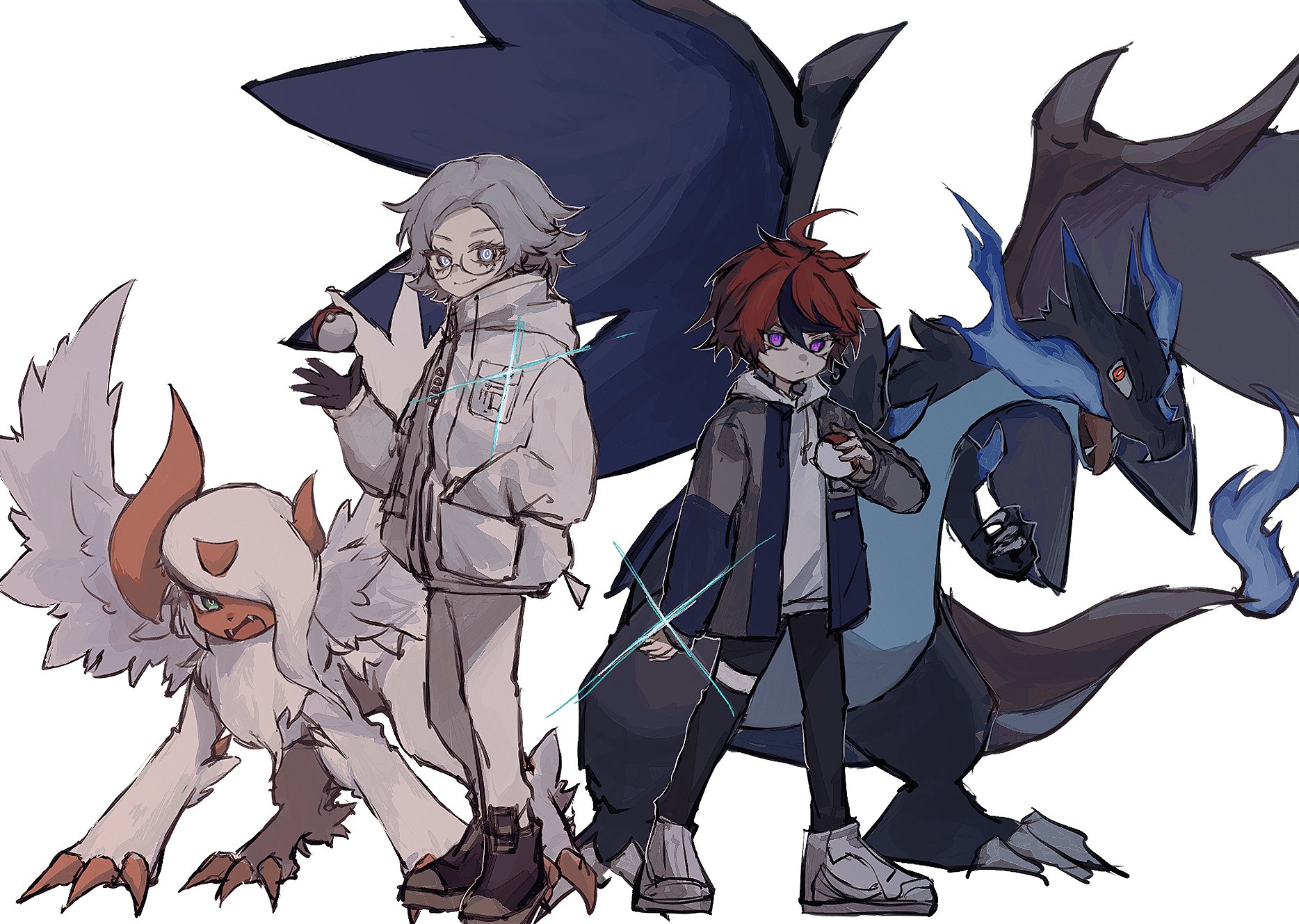 2boys absol ahoge alternate_color aotsuki_eito black_gloves black_pants black_shoes black_streaks blue_eyes blue_fire blue_jacket charizard crossover dragon fire gen_1_pokemon gen_3_pokemon glasses glint gloves grey_eyes grey_hair grey_jacket highres holding holding_poke_ball hood hoodie jacket jacket_over_hoodie looking_at_viewer male_focus mega_absol mega_charizard_x mega_pokemon multicolored_hair multicolored_jacket multiple_boys nintendo pants poke_ball pokemon pokemon_(creature) red_eyes red_hair shiny_pokemon shoes short_hair simple_background sparrowhabird streaked_hair sumino_takumi the_hundred_line_-last_defense_academy- tongue tongue_out two-tone_jacket white_hoodie white_jacket white_pants white_shoes