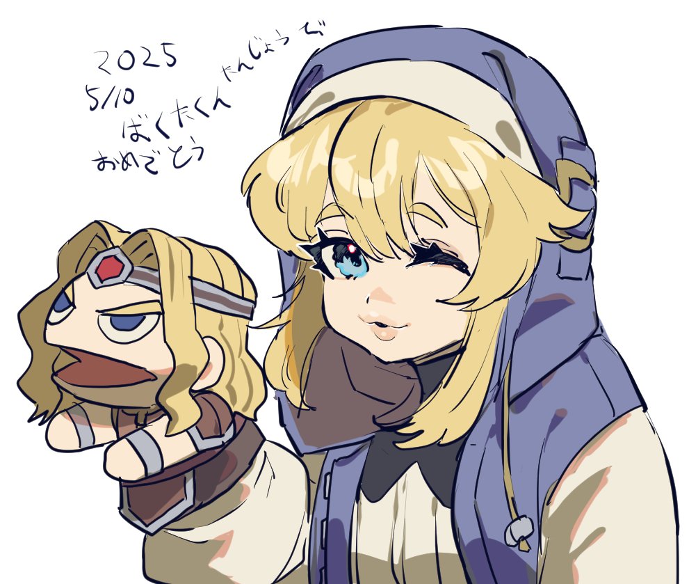2025 2boys blonde_hair blue_eyes blue_jacket bridget_(guilty_gear) castlevania_(1986) castlevania_(series) character_doll circlet dancho_no_mori dated doll guilty_gear guilty_gear_strive hand_puppet hand_up hood hood_up hooded_jacket jacket lingerie looking_at_viewer male_focus multiple_boys one_eye_closed parted_lips puppet short_hair simon_belmont smile solo translation_request trap underwear upper_body v-shaped_eyebrows v-shaped_eyes white_sleeves
