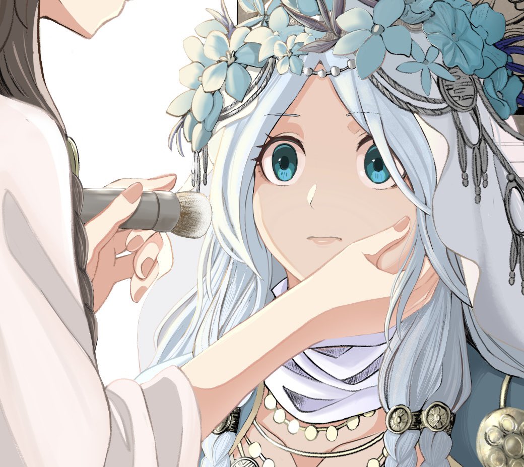 2girls applying_another's_makeup applying_makeup blue_cape blue_eyes brown_hair cape chloe_northerncroft dress elden_ring elden_ring_nightreign flower_wreath hand_on_another's_face head_wreath jewelry kageisland_9lov makeup_brush multiple_girls revenant_(elden_ring) solo_focus veil white_background white_dress white_veil wide_sleeves