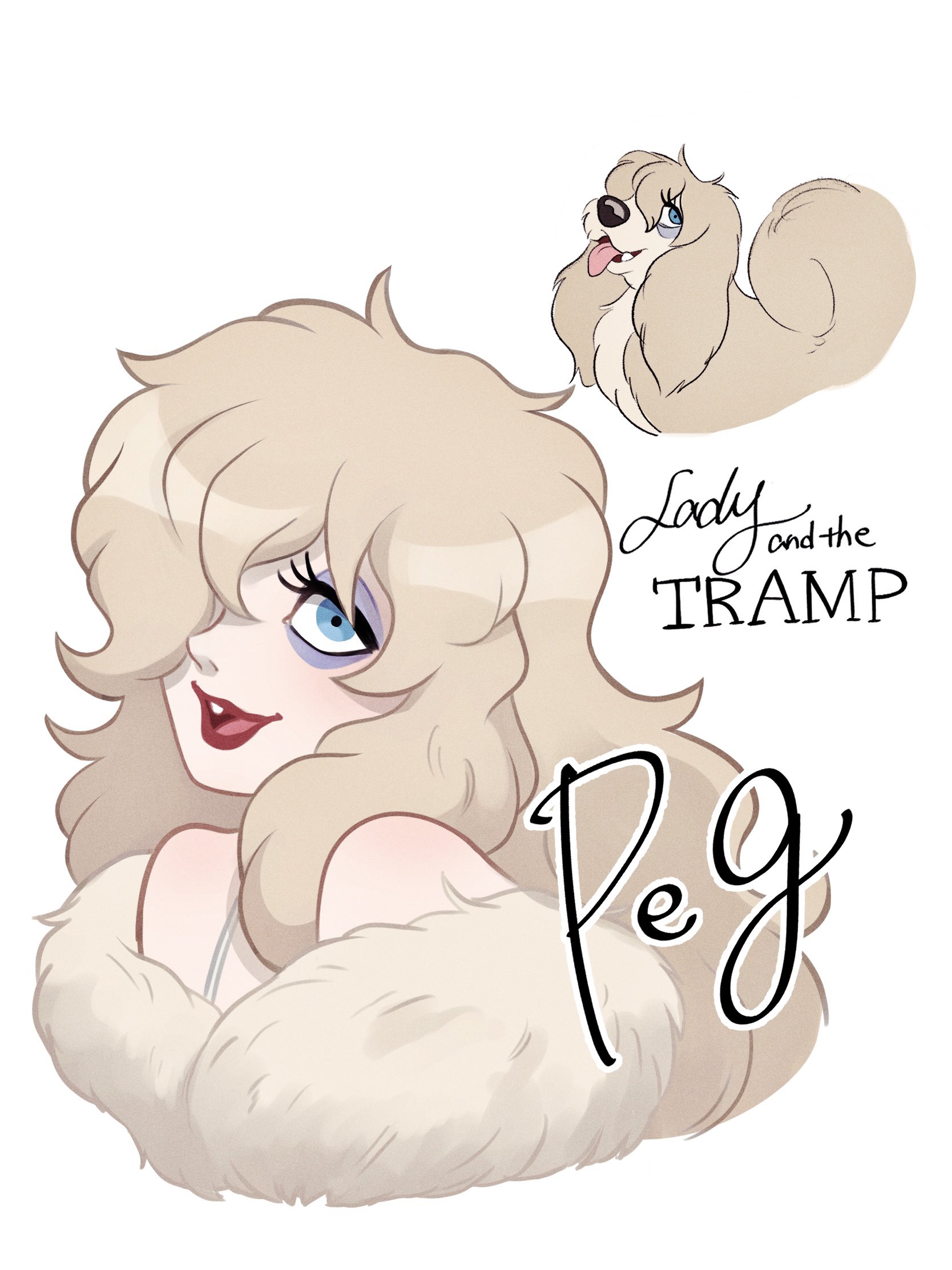 animal_collar animification blonde_hair blue_eyes collar dog dress hair_over_one_eye highres humanization lady_and_the_tramp makeup mascara moko_eaka open_mouth parted_lips peg_(disney) personification reference_inset simple_background smile tail wavy_hair