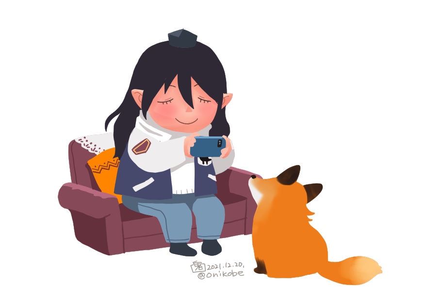 1girl alternate_costume black_hair blue_hat blue_pants blue_vest cellphone chibi chibi_only closed_eyes closed_mouth commentary_request couch dated fox full_body hat holding holding_phone iizunamaru_megumu kudamaki_tsukasa kudamaki_tsukasa_(fox) long_hair no_lineart onikobe_rin pants phone pointy_ears simple_background smartphone smile solo sweater taking_picture tokin_hat touhou vest white_background white_sweater