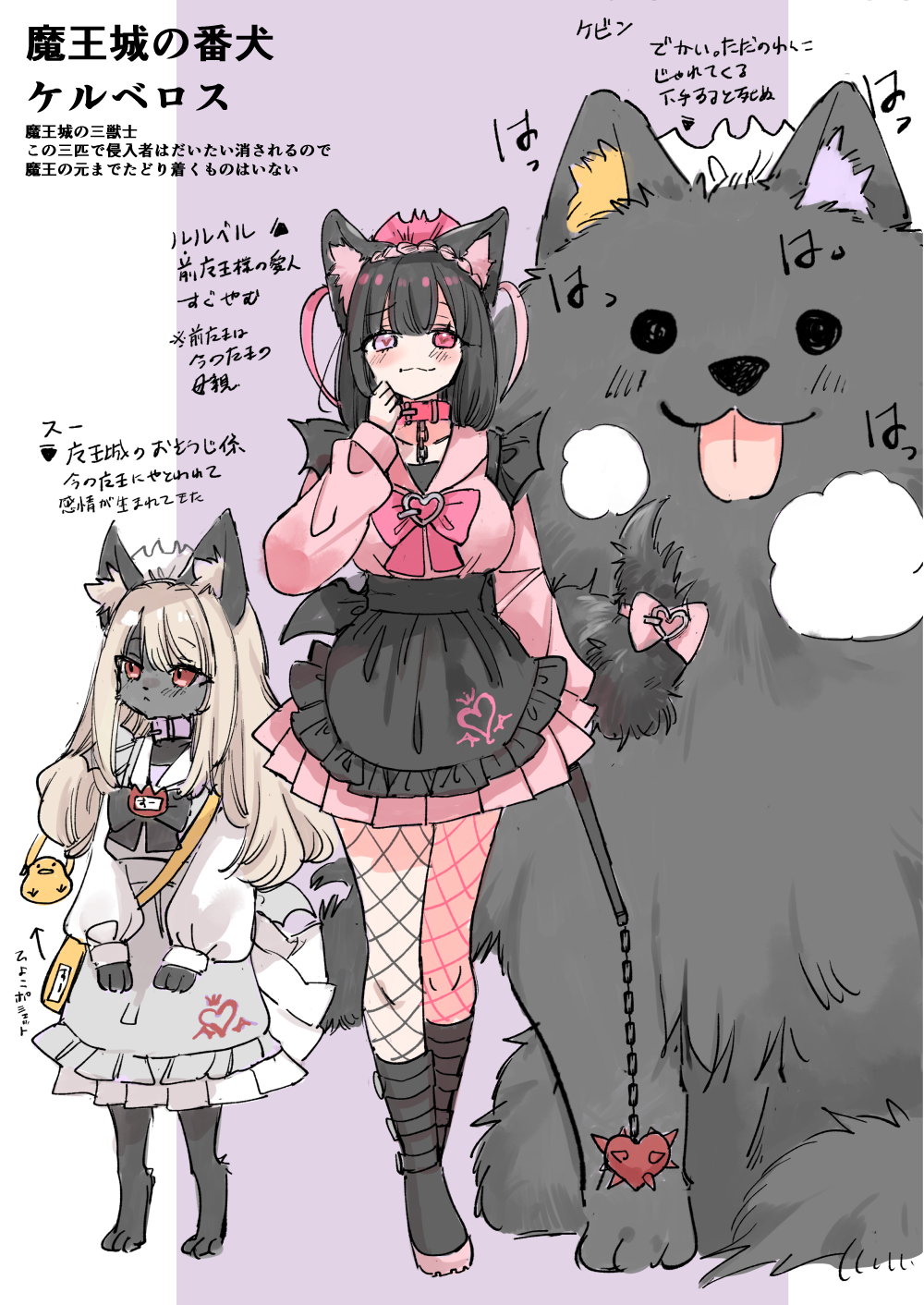 2girls animal animal_ear_fluff apron arrow_(symbol) bag black_apron black_boots black_hair blush boots bow breasts closed_mouth comiket_106 dog dress fishnet_pantyhose fishnets flail frilled_apron frills furry furry_female grey_apron hand_up heart heart-shaped_pupils heterochromia highres knee_boots long_sleeves looking_at_viewer medium_breasts mito_(go!go!king!) multiple_girls original pantyhose pink_bow pink_dress pleated_dress puffy_long_sleeves puffy_sleeves purple_background purple_eyes red_eyes shoulder_bag smile spikes symbol-shaped_pupils translated two-tone_background waist_apron weapon white_background white_dress