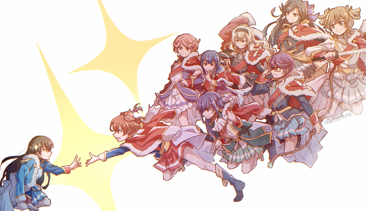 6+girls :d adjusting_eyewear aiguillette aijo_karen ascot axe belt belt_buckle black-framed_eyewear black_hair black_hairband black_jacket blonde_hair blue_hair blue_jacket blue_skirt boots bow_(weapon) brown_eyes brown_hair buckle closed_mouth collared_jacket commentary_request curtained_hair daiba_nana flipped_bangs floating green_eyes green_jacket grey_boots grey_skirt hair_between_eyes hairband hanayagi_kaoruko hand_rest hand_up holding holding_axe holding_bow_(weapon) holding_mace holding_sword holding_weapon hoshimi_junna isurugi_futaba jacket kagura_hikari katana kneeling lapels locked_arms long_hair long_sleeves looking_at_another love_judgement_(mace) mace medium_hair mishiro_(andante) multicolored_jacket multiple_girls notched_lapels open_clothes open_jacket open_mouth outstretched_arm parted_lips pink_hair purple_eyes purple_hair purple_jacket purple_skirt reaching reaching_towards_another red_jacket red_sash red_skirt saijo_claudine sash short_hair short_twintails shoujo_kageki_revue_starlight shoulder_sash sidelocks skirt smile sparkle_background sword tassel tendo_maya tsuyuzaki_mahiru twintails two_side_up waist_cape wavy_hair weapon white_ascot white_jacket yellow_belt yellow_trim