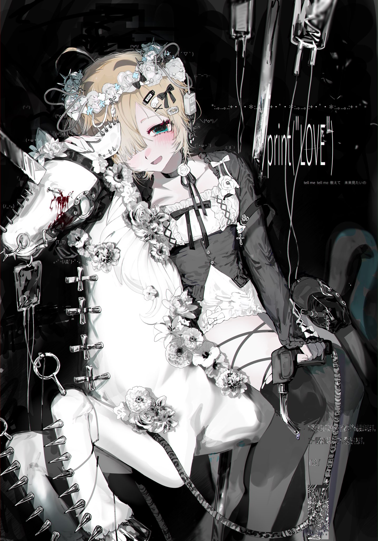 1girl bandages blonde_hair blood blood_bag blue_eyes blunt_bangs choker collarbone drugs flower goth_fashion hair_over_one_eye head_wreath highres holding horseback_riding intravenous_drip long_sleeves original pakiruchang ribbon_choker riding rocking_horse short_hair thighhighs white_flower