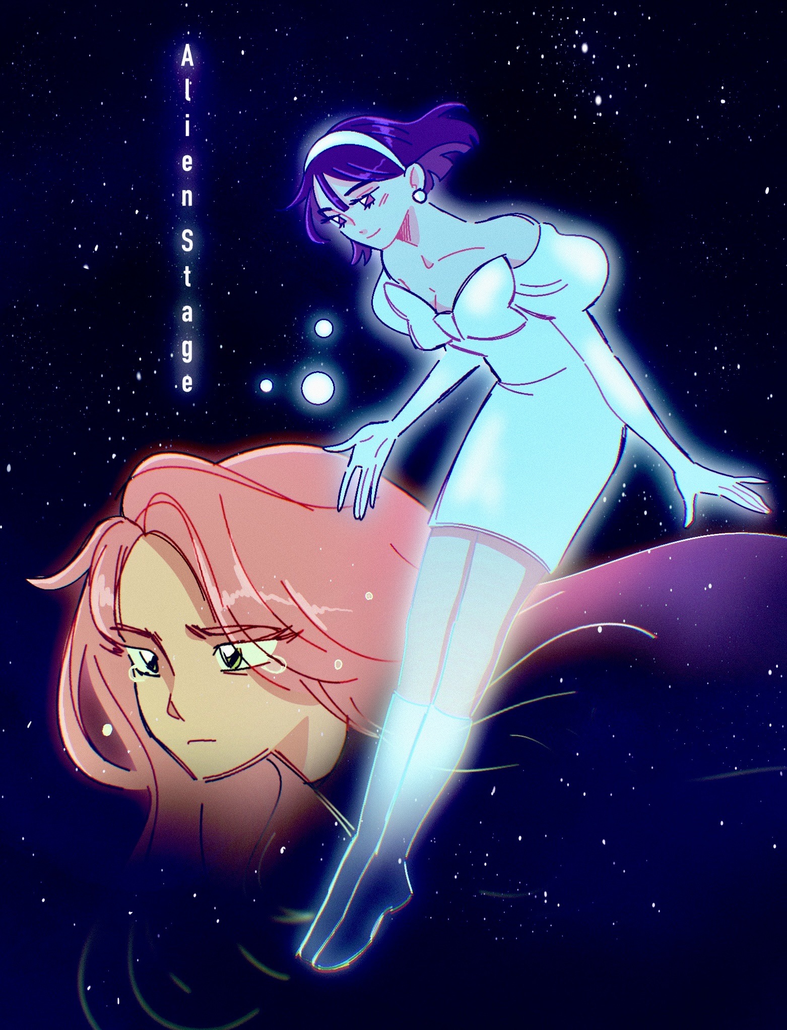2girls alien_stage black_hair closed_mouth commentary copyright_name dress earrings elbow_gloves english_commentary english_text floating_head frown gloves green_eyes hairband highres jewelry juliet_sleeves long_hair long_sleeves mizi_(alien_stage) multiple_girls off-shoulder_dress off_shoulder perennimal pink_hair puffy_sleeves purple_eyes short_hair smile space star_(sky) sua_(alien_stage) white_dress white_gloves white_hairband