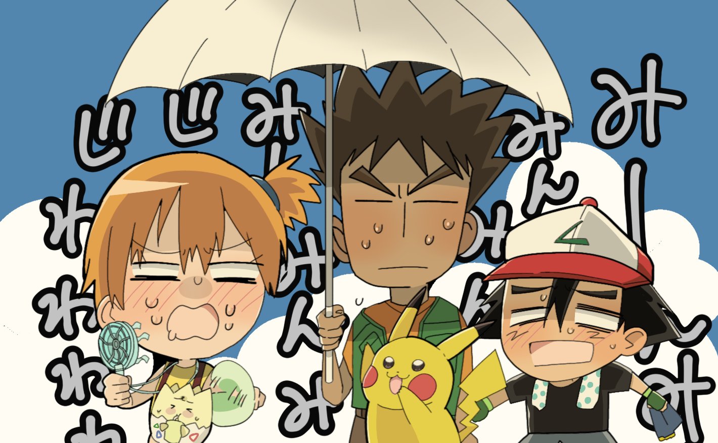 1girl 2boys ash_ketchum baseball_cap black_hair blush brock_(pokemon) brown_hair closed_eyes electric_fan gen_1_pokemon gen_2_pokemon hair_between_eyes hand_fan hat holding holding_umbrella hot misty_(pokemon) multiple_boys nintendo open_mouth orange_hair paper_fan pikachu pokemon pokemon_(anime) pokemon_(classic_anime) pokemon_(creature) pokemon_red/green/blue/yellow ponytail shirt short_hair side_ponytail spiked_hair sweat togepi towel umbrella wavy_mouth white_umbrella yellow_shirt