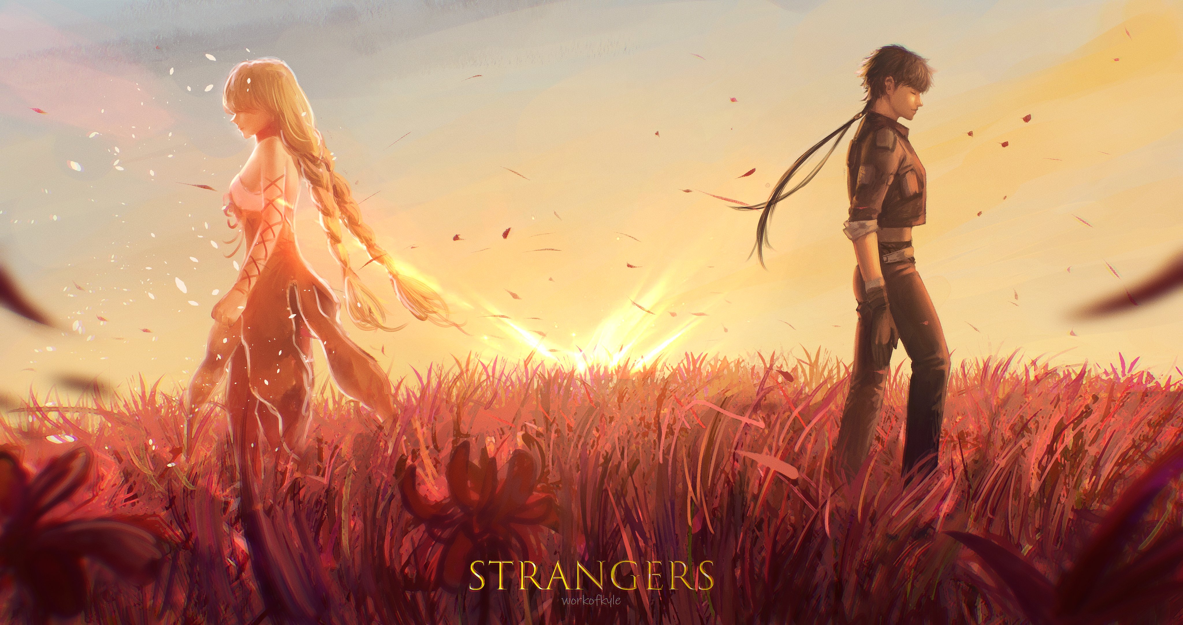 1boy 1girl absurdres artist_name black_gloves black_hair black_jacket black_pants braid breasts commentary dress english_commentary english_text from_side gloves grey_hair highres jacket long_hair low_twin_braids male_rover_(wuthering_waves) outdoors pants petals phrolova_(wuthering_waves) red_dress red_petals rover_(wuthering_waves) sleeves_rolled_up small_breasts sunrise twin_braids workofkyle wuthering_waves