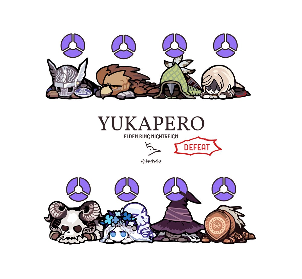 >_< 3boys 5girls :3 arm_shield armor artist_name beak black_cloak black_skin blindfold_mask blue_eyes brown_gloves cape chibi chibi_only cloak colored_skin commentary_request curled_horns defeat duchess_(elden_ring) elden_ring elden_ring_nightreign english_text executor_(elden_ring) eye_mask feathered_wings flower_wreath furry furry_male gameplay_mechanics gauntlets gloves greaves green_cape green_hood grey_beard guardian_(elden_ring) hat hat_feather head_wreath helm helmet hiko_(lg612) horns ironeye_(elden_ring) jitome knight long_hair lying mask mouth_mask multiple_boys multiple_girls on_stomach pale_skin ponytail quiver raider_(elden_ring) recluse_(elden_ring) revenant_(elden_ring) simple_background skeleton skull_mask topknot twitter_username veil white_background white_hair white_skin white_veil winged_helmet wings witch witch_hat wylder_(elden_ring)