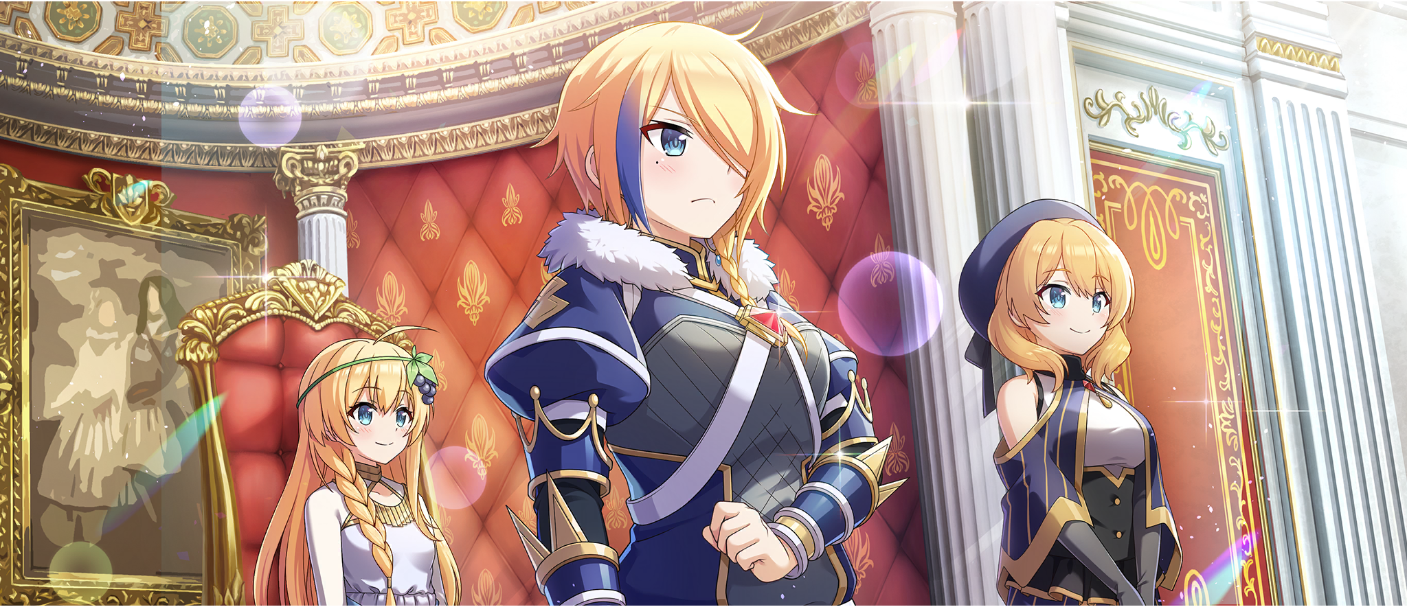 3girls ahoge beret black_corset blonde_hair blue_capelet blue_coat blue_eyes blue_hat blue_streaks braid capelet claire_(konosuba) clenched_hand closed_mouth coat corset dress elbow_gloves food-themed_hair_ornament game_cg gloves gold_necklace grape_hair_ornament green_hairband grey_gloves hair_ornament hair_over_one_eye hair_over_shoulder hairband hat highres indoors iris_(konosuba) jewelry kono_subarashii_sekai_ni_shukufuku_wo! konosuba!_fantastic_days light_blush long_hair long_sleeves looking_ahead medium_hair mole mole_under_eye multicolored_hair multiple_girls necklace off-shoulder_capelet official_art one_eye_covered rain_(konosuba) serious short_hair side_braid sidelocks smile streaked_hair sunlight white_dress