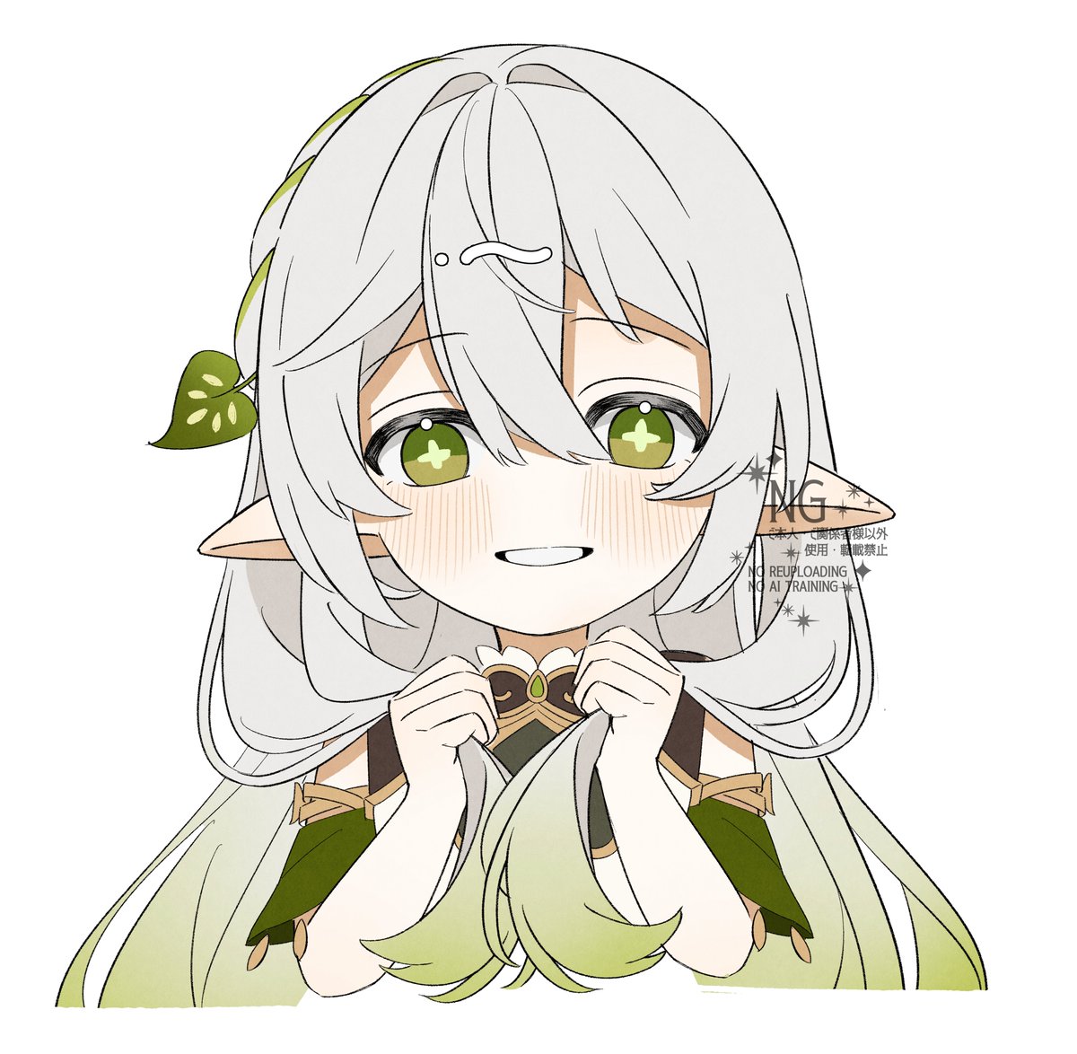 1girl alternate_hairstyle blush commentary cropped_torso cross-shaped_pupils genshin_impact gradient_hair green_eyes green_hair hair_between_eyes hair_ornament hashtag-only_commentary holding holding_own_hair kumane_(osakanadonn) leaf_hair_ornament long_hair looking_at_viewer multicolored_hair nahida_(genshin_impact) parted_lips pointy_ears simple_background smile solo symbol-shaped_pupils very_long_hair white_background white_hair