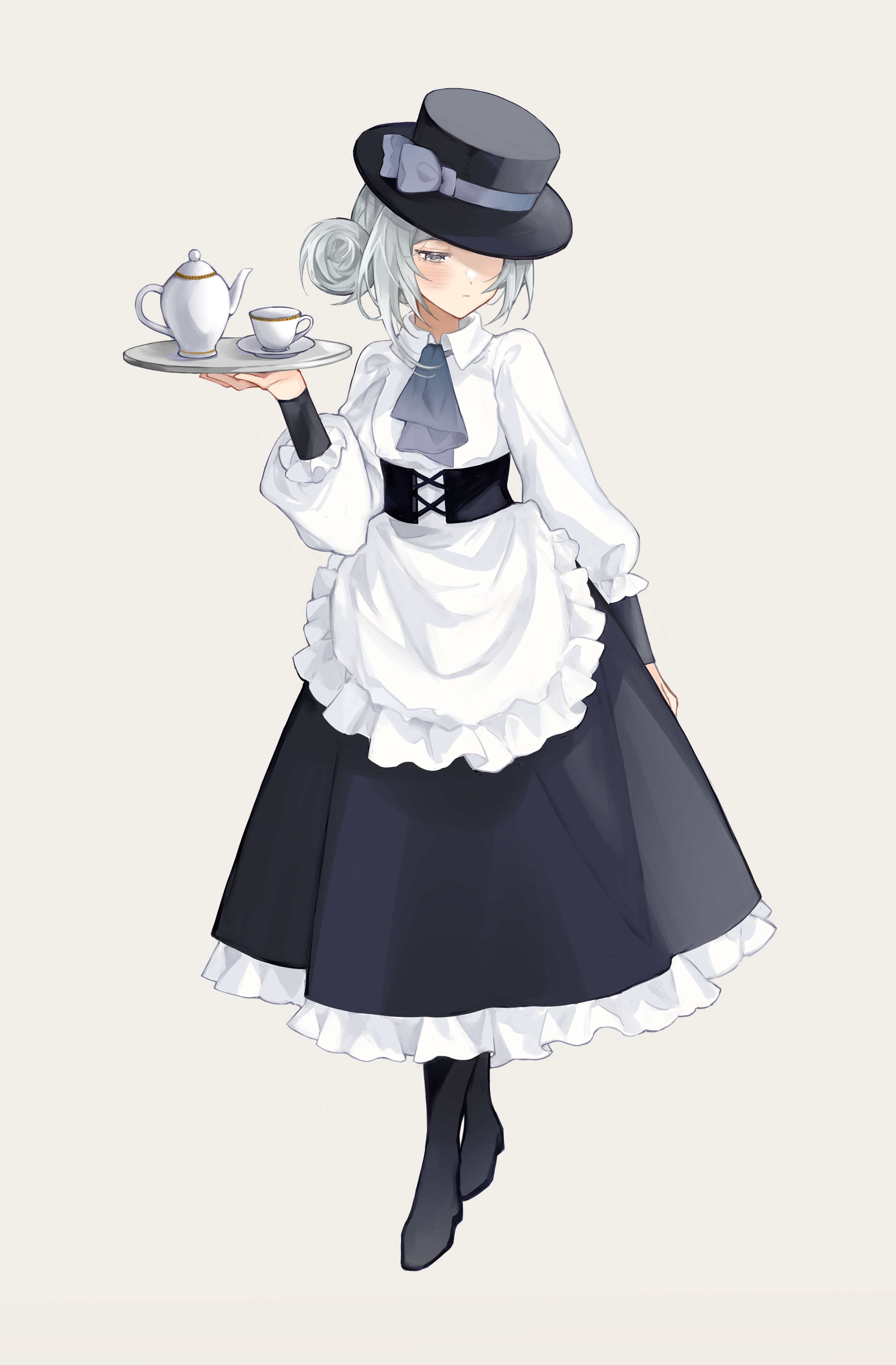 1girl absurdres alternate_costume apron ascot black_boots black_corset black_hat black_skirt blue_ascot blue_bow boater_hat boots bow closed_mouth collared_shirt corset cup enmaided frilled_apron frilled_skirt frills full_body grey_background grey_eyes grey_hair hair_bun hair_over_one_eye half-closed_eyes hand_up hat hat_bow highres holding holding_tray long_skirt long_sleeves looking_down looking_to_the_side maid mao_(1642598405) one_eye_covered puffy_long_sleeves puffy_sleeves reverse:1999 saucer shirt short_hair single_side_bun skirt solo standing teacup teapot tray vertin_(reverse:1999) waist_apron white_apron white_shirt