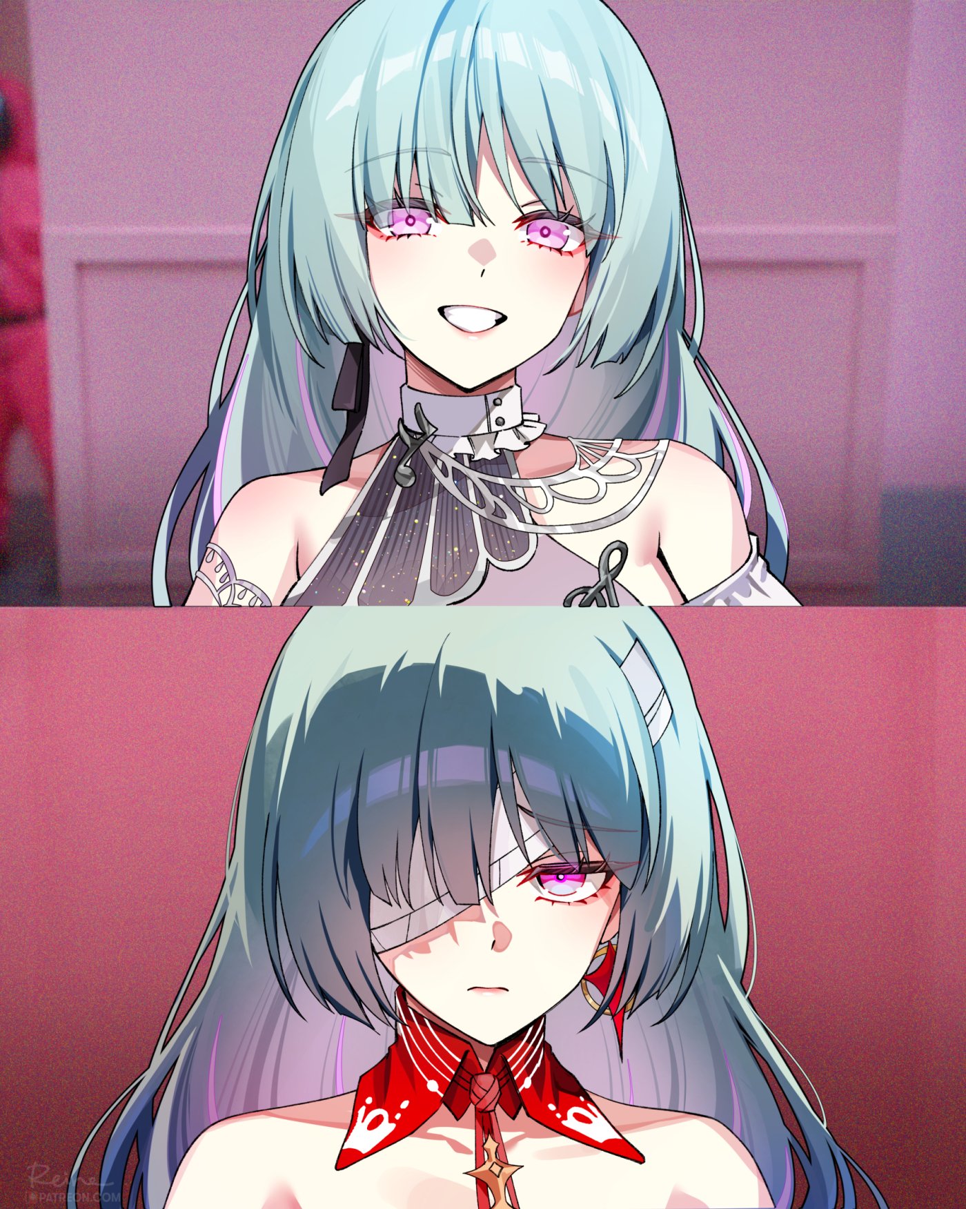 1girl bandage_over_one_eye bandages collar detached_collar foxyreine grey_hair highres long_hair meme official_alternate_design one_eye_covered phrolova_(wuthering_waves) pink_eyes red_collar smile solo split_theme wuthering_waves year_1_&_year_2_(squid_game)_(meme)