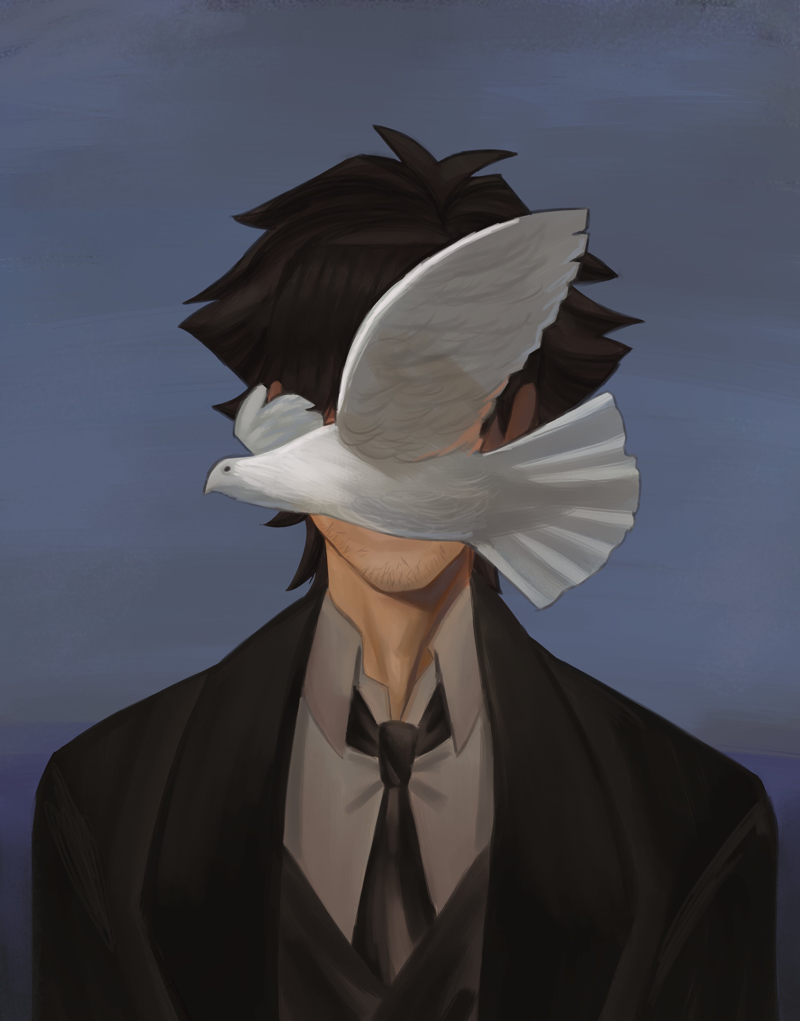 1boy absurdres bird black_hair black_necktie black_suit black_vest censored censored_identity collared_shirt covered_face dove emiya_kiritsugu fate/zero fate_(series) fine_art_parody formal_clothes highres male_focus necktie parody shirt solo suit the_son_of_man_(magritte) upper_body vest walperabend white_shirt