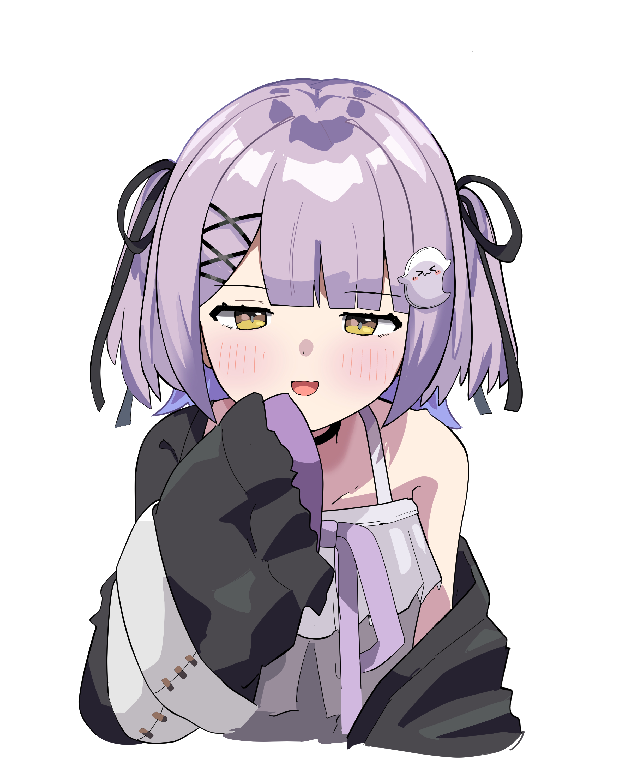 1girl absurdres black_choker black_jacket black_ribbon blush choker commentary cropped_torso ghost_hair_ornament hair_ornament hair_ribbon hashtag-only_commentary highres jacket looking_at_viewer mitche off_shoulder open_clothes open_jacket open_mouth purple_hair ribbon shinomiya_runa shinomiya_runa_(1st_costume) shirt simple_background solo virtual_youtuber vspo! white_background white_shirt yellow_eyes