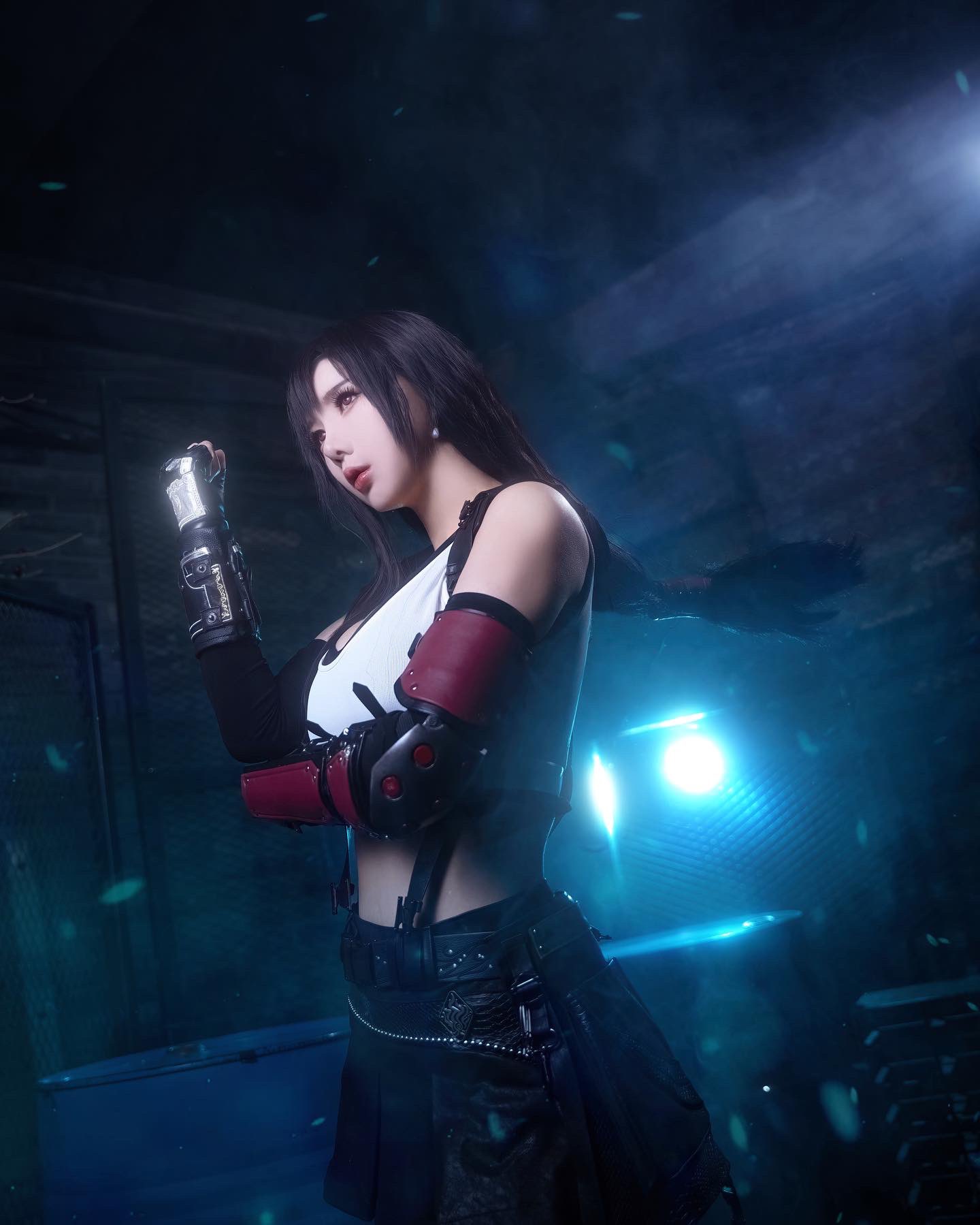 1girl bare_shoulders black_hair black_skirt blurry blurry_background breasts cosplay cosplay_photo earrings female_focus final_fantasy final_fantasy_vii final_fantasy_vii_remake gauntlets gloves highres ja10888 jewelry korean_(nationality) large_breasts long_hair photo_(medium) real_life red_eyes skirt solo square_enix tank_top tifa_lockhart tifa_lockhart_(cosplay) white_tank_top