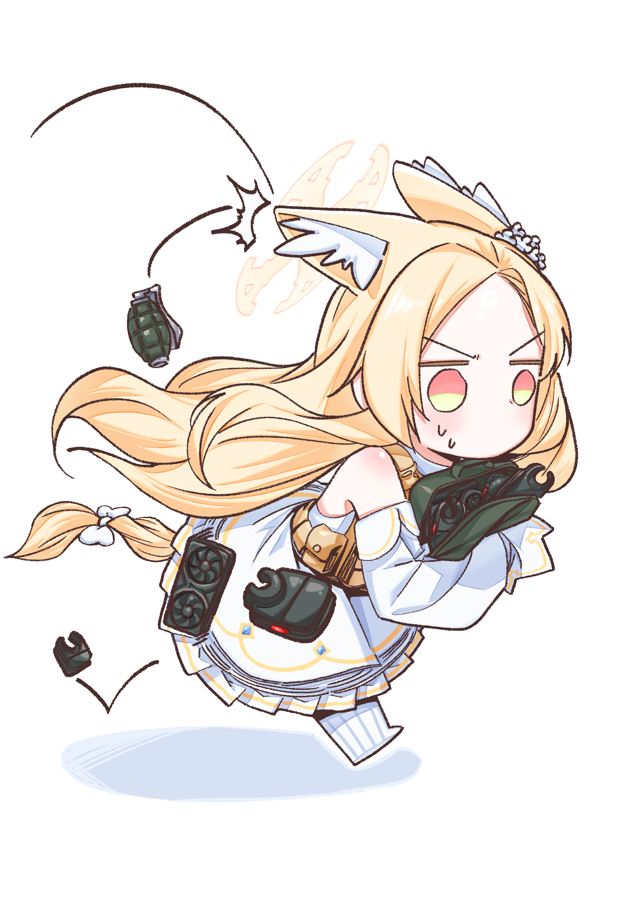 1girl absurdres animal_ear_fluff animal_ears bag blonde_hair blue_archive blush charmbird closed_mouth commission dress explosive flower forehead fox_ears fox_girl green_bag grenade hair_flower hair_ornament halo highres holding holding_bag long_hair pink_hair pixiv_commission running seia_(blue_archive) socks solo white_dress white_flower white_socks wrist_cuffs yellow_halo