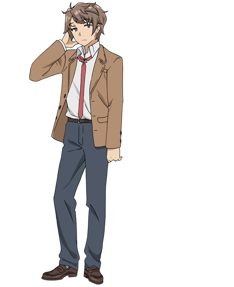 1boy 1girl anime_coloring arm_up azusagawa_sakuta belt blazer brown_belt brown_eyes brown_hair brown_jacket closed_mouth collared_shirt dress_shoes full_body grey_pants hand_in_own_hair jacket long_sleeves looking_at_viewer necktie official_art open_clothes open_jacket pants red_necktie school_uniform seishun_buta_yarou shirt short_hair simple_background solo standing tamura_satomi transparent_background white_shirt