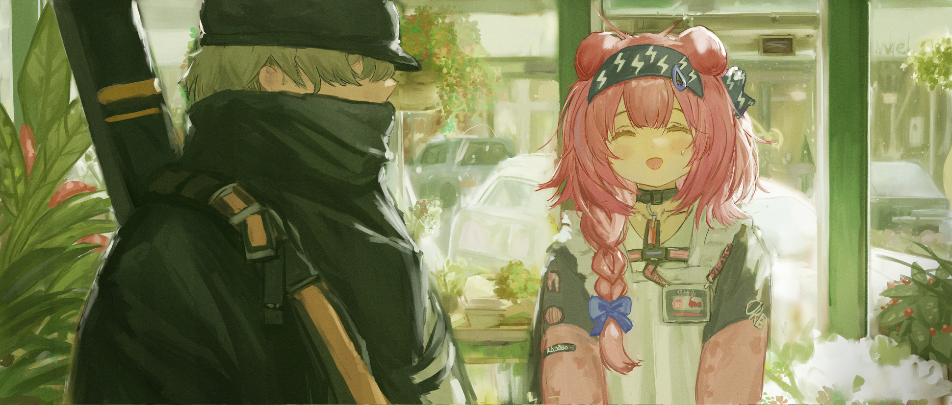1boy 1girl animal_ears arknights blue_bow bow braid cat_ears closed_eyes goldenglow_(arknights) gumiaoandpeace hair_bow hairband highres lightning_bolt_print pink_hair red_(npc)_(arknights)