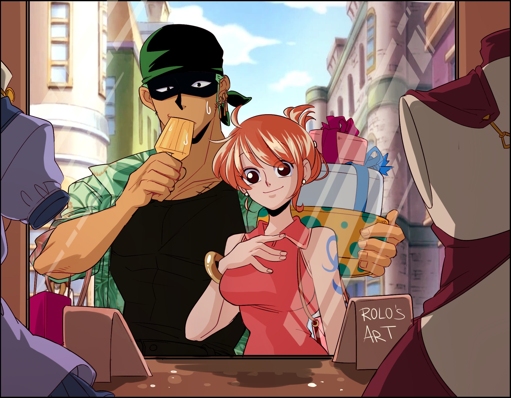 1boy 1girl artist_name bag bandana bangle bare_shoulders birthday black_bandana black_shirt blue_sky box bracelet breasts building closed_mouth cloud cloudy_sky commentary earrings english_commentary food food_in_mouth gift gift_box green_hair green_shirt hair_up height_difference highres holding holding_box holding_food holding_popsicle jewelry looking_at_viewer medium_breasts nami_(one_piece) one_piece open_clothes open_shirt orange_hair pearl_earrings pink_shirt popsicle rolo's_art roronoa_zoro scar scar_on_chest shirt shopping short_hair shoulder_bag shoulder_tattoo single_sidelock sky sleeveless sleeveless_shirt smile sweatdrop tattoo unworn_clothes upper_body