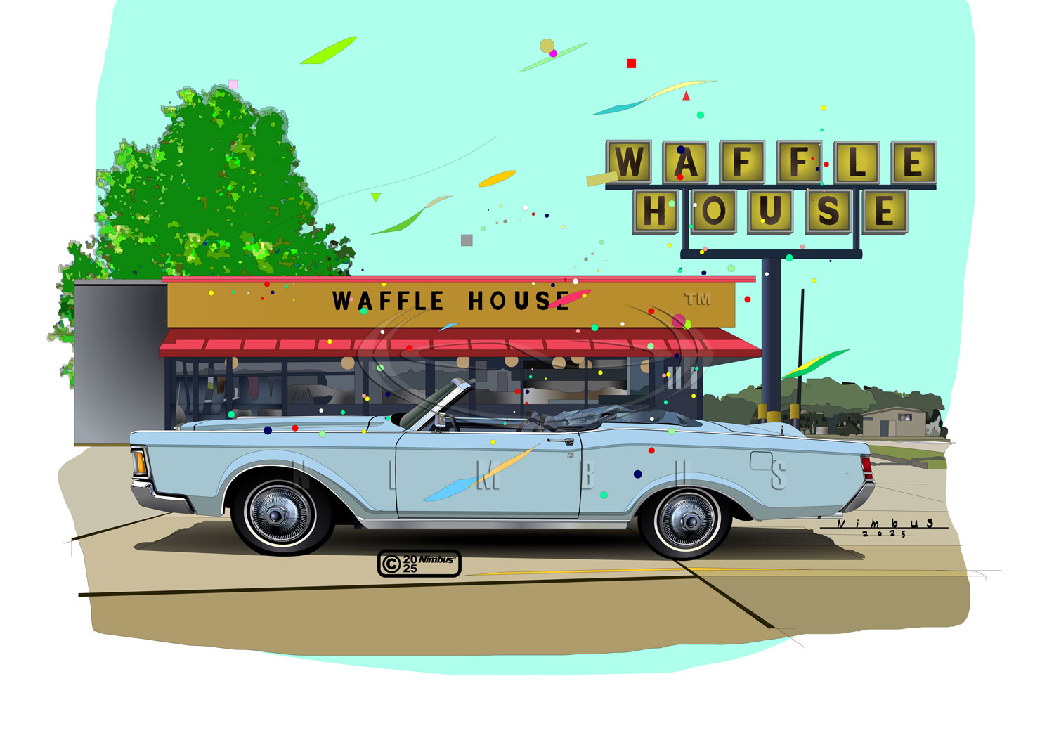 blue_sky building car commentary_request grey_car lincoln_(company) lincoln_continental motor_vehicle nimbus_goldbrum no_humans original outdoors restaurant sky tree vehicle_focus waffle_house whitewall_tires