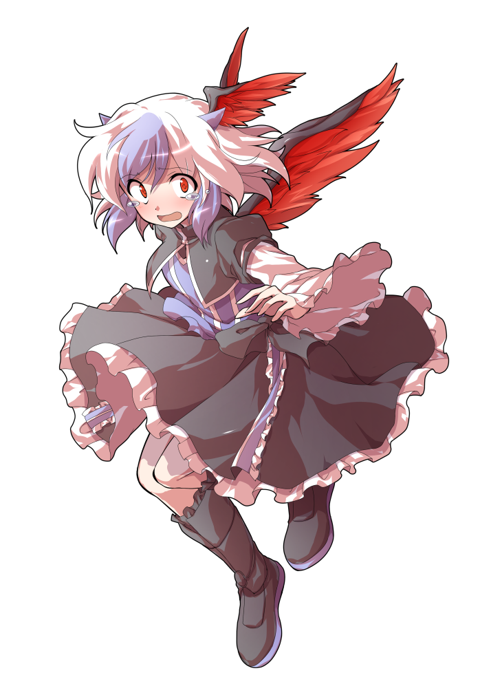 1girl alphes_(style) black_boots black_skirt blue_hair blush boots commentary_request dairi feathered_wings frilled_skirt frilled_sleeves frills full_body head_wings horns large_variant_set long_sleeves multicolored_hair parody red_wings short_hair single_head_wing skirt solo style_parody tachi-e tokiko_(touhou) touhou transparent_background two-tone_hair variant_set white_hair wings